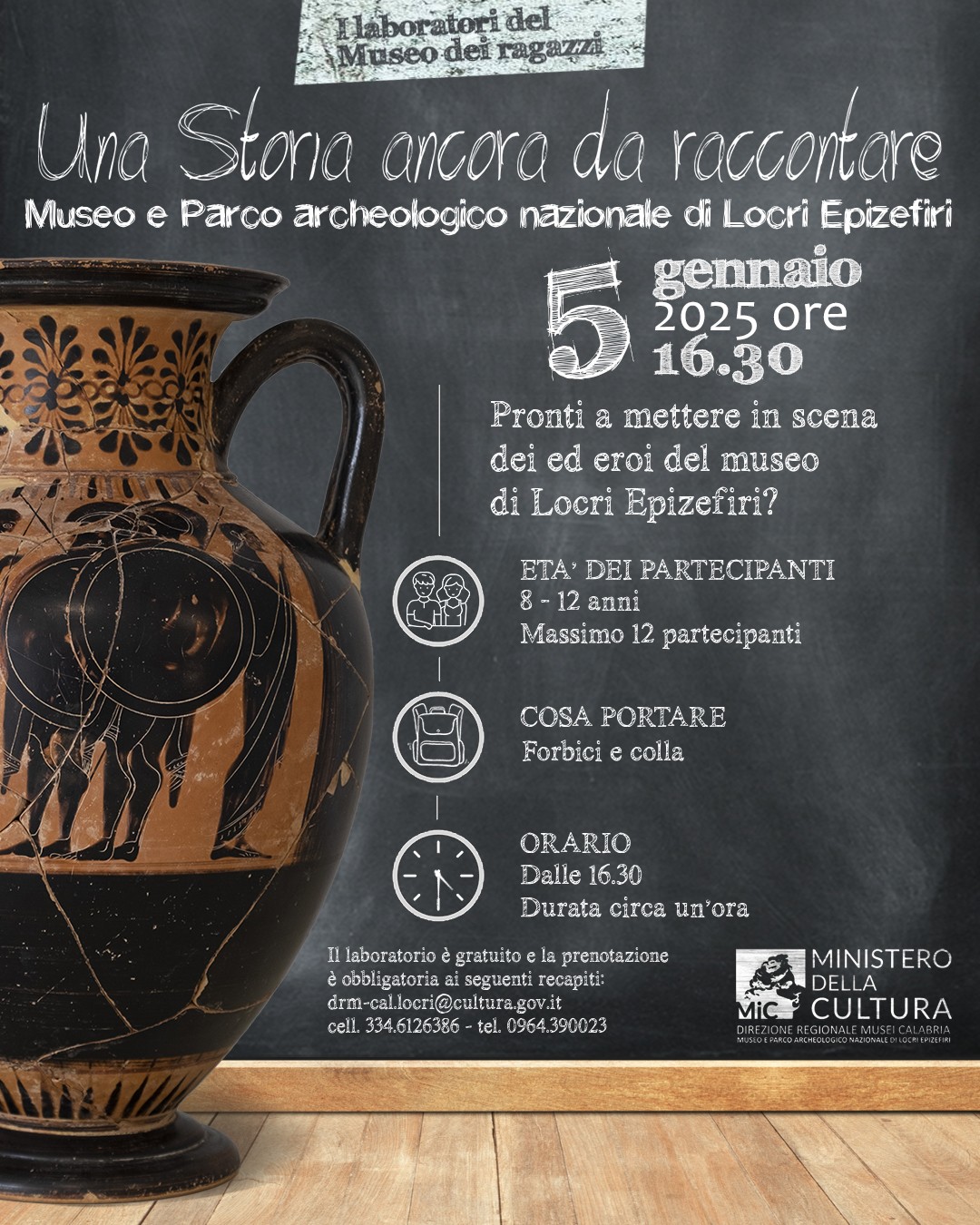 Il laboratorio è gratuito e la prenotazione obbligatoria ai seguenti recapiti: drm-cal.locri@cultura.gov.it +39 0964 390023; 334.6126386