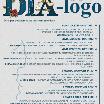 Nell’ambito del ciclo di incontri organizzato dall’Istituto scolastico Liceo Scientifico, linguistico, sportivo Leonardo di Agrigento per la settimana che precede la Giornata internazionale della donna, dal titolo “DIA-logo. Il nostro 8 marzo”, in data 5 marzo p.v., presso l’aula magna del plesso Cimarra, si svolgerà il seminario dal titolo "Donne. In-visibili tra le pagine della storia", a cura del Direttore dell’Archivio di Stato di Agrigento, Dott.ssa Rossana Florio. L’incontro, accompagnato da un’attività laboratoriale, è finalizzato ad una riflessione sulla storia di genere attraverso le fonti archivistiche, con una selezione documentale incentrata sulla storia delle donne nel periodo della seconda guerra mondiale.