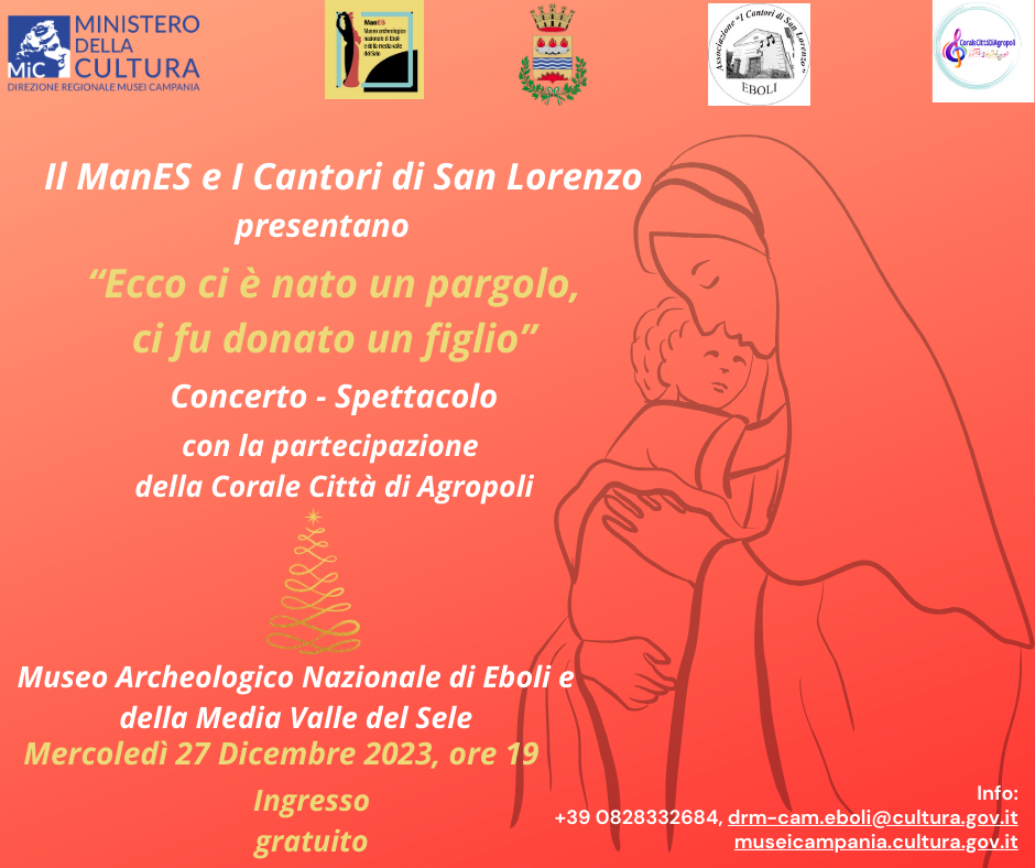 Mercoledì 27 dicembre 2023 il ManES - Museo Archeologico Nazionale di Eboli e della Media Valle del Sele, oltre alla consueta apertura fino alle ore 19.00, prolungherà straordinariamente il proprio orario fino alle 21.30 (ultimo ingresso ore 21.00), nell’ambito delle iniziative promosse dal Ministero della Cultura per la valorizzazione dei musei e luoghi della cultura statali.