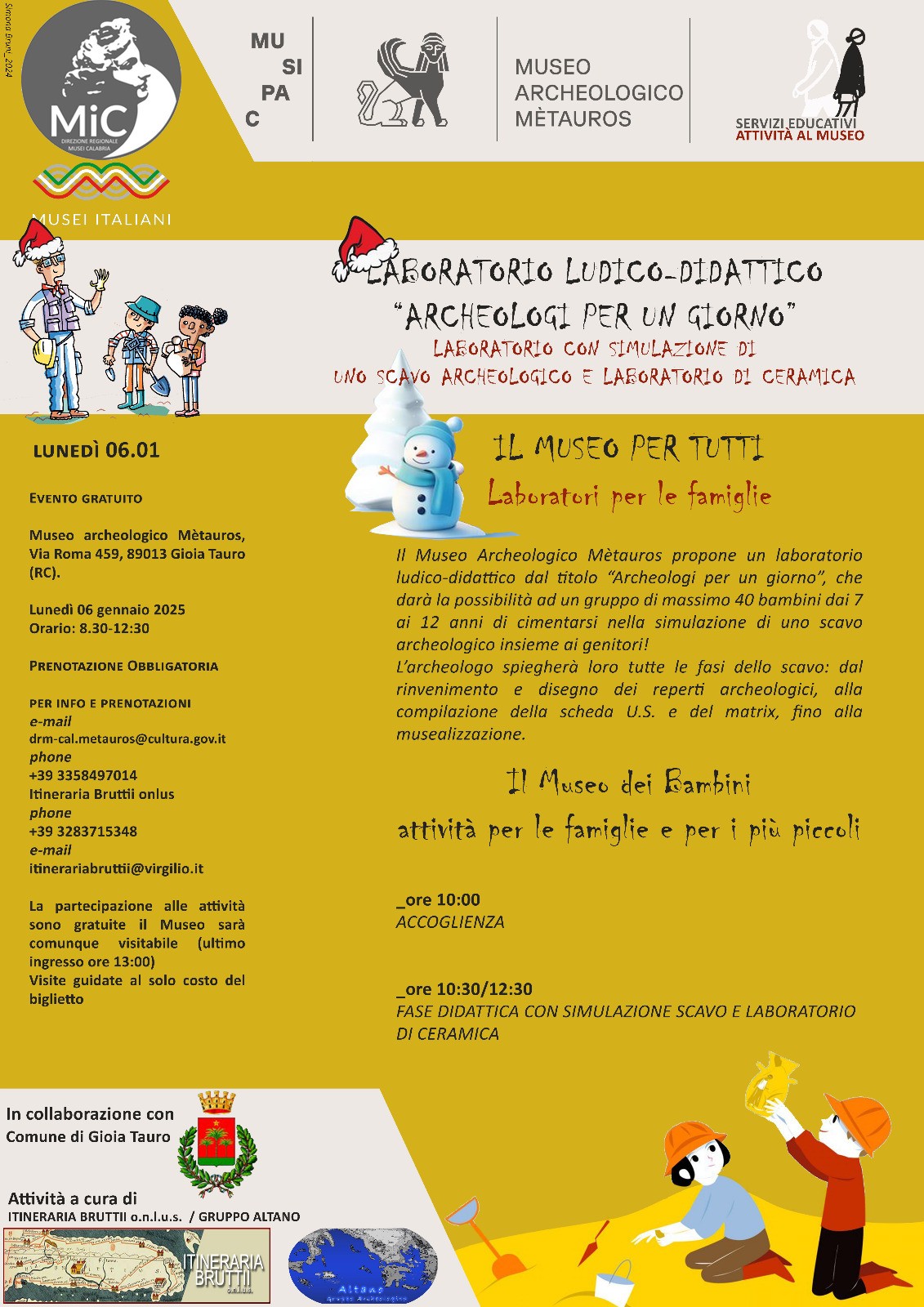 Il Museo archeologico Mètauros propone con Itineraria Bruttii e Gruppo Archeologico Altano,“Archeologi per un giorno” Simulazione di uno scavo archeologico e laboratorio di ceramica, una mattina speciale dedicata a famiglie e bambini per l’apertura straordinaria del giorno dell’Epifania.