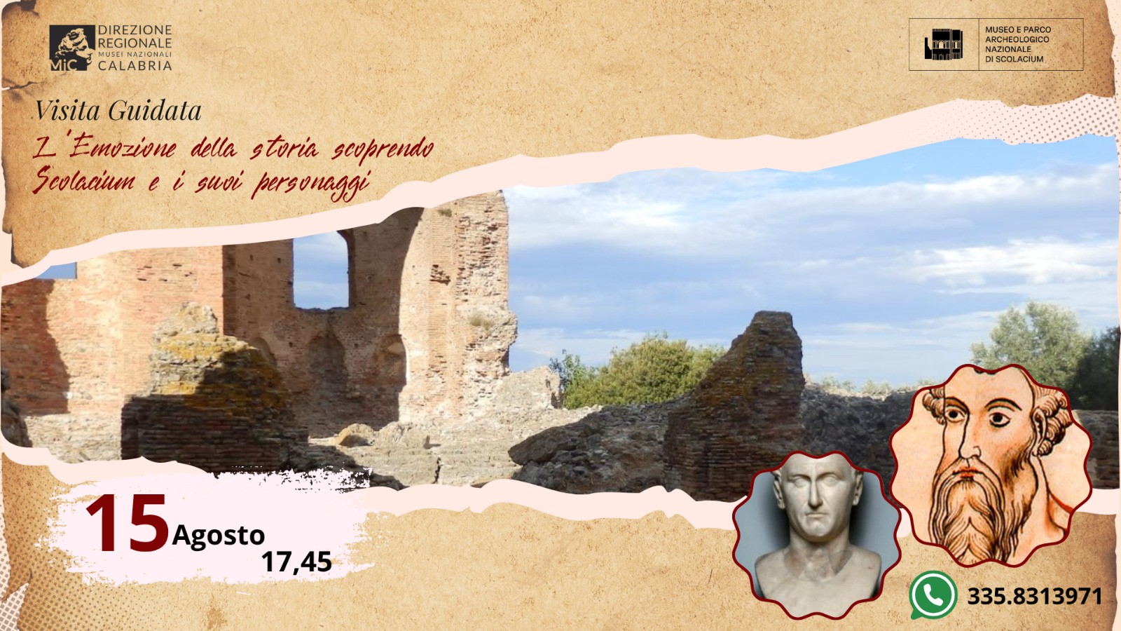 Venerdì 15 agosto, alle ore 17:45 sarà possibile prendere parte alla visita guidata "l'Emozione della storia . . . scoprendo Scolacium e i suoi personaggi" volta alla scoperta di un tempo passato ma ancora presente. La partecipazione alla visita è inclusa nel costo del biglietto. Non è necessaria la prenotazione.