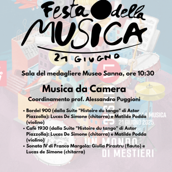 In occasione della Festa della Musica 2025 il Museo Nazionale Archeologico ed Etnografico “G.A. Sanna” invita il pubblico a uno spettacolo di musica dal vivo che si terrà nella sala del medagliere del museo sabato 21 giugno alle 10.30. L’evento è organizzato in collaborazione con il Conservatorio Luigi Canepa di Sassari e vedrà l’esibizione degli allievi della classe di Musica da Camera del prof. Alessandro Puggioni.