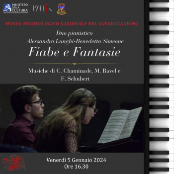 Il primo appuntamento è per venerdì 5 gennaio alle ore 16.30: il duo pianistico Alessandro Lunghi - Benedetta Simeone propone “Fiabe e Fantasie”, con musiche di C. Chaminade, Ravel e Schubert.