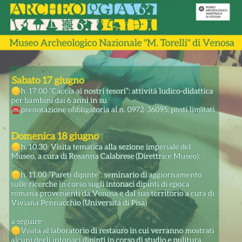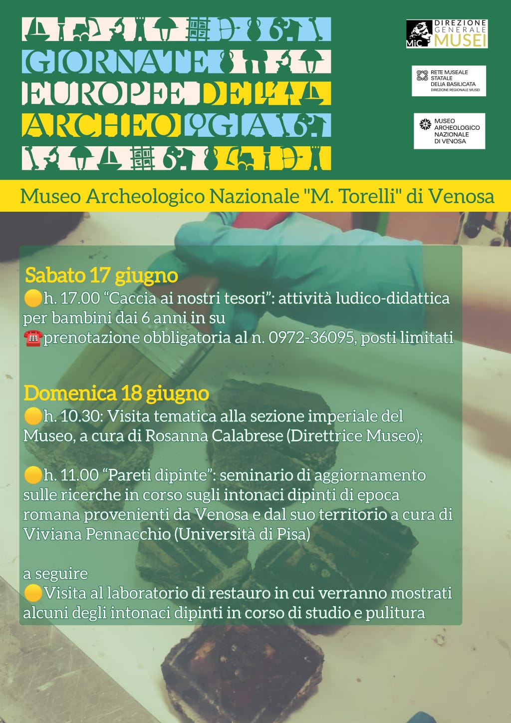 Il 17 e il 18 giugno il Museo Archeologico di Venosa prende parte alle “Giornate Europee dell’Archeologia”, manifestazione internazionale in cui tutti gli attori istituzionali del mondo dell'archeologia si mettono all’opera per far scoprire al pubblico i tesori del patrimonio e i retroscena di questo settore.