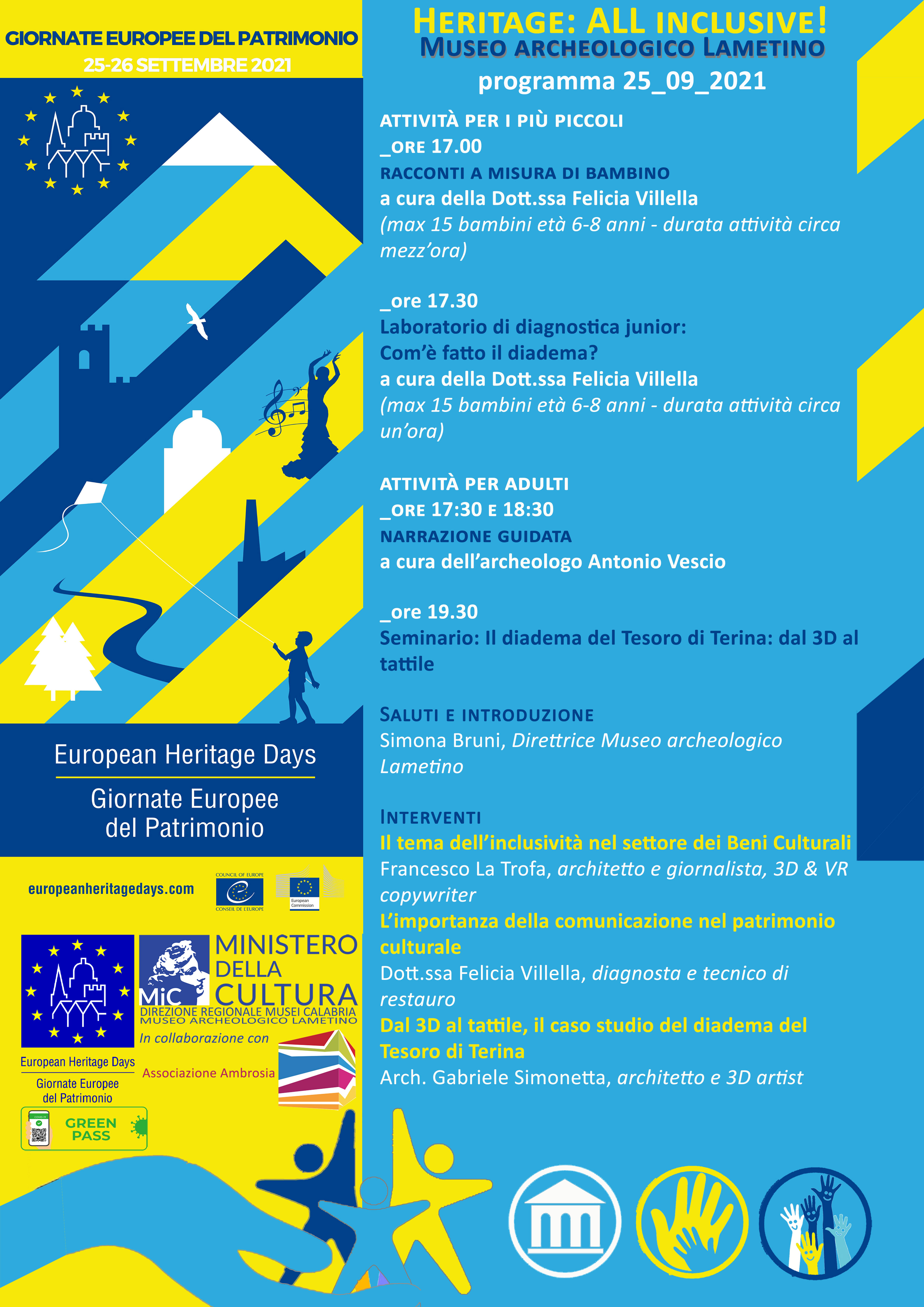Dopo i saluti e l’introduzione di Simona Bruni, direttore Museo archeologico lametino seguiranno le relazioni di F. La Trofa sul tema dell’inclusività nel settore dei beni culturali, di F. Villella sull’importanza della comunicazione nel patrimonio culturale e infine di G. Simonetta sul caso studio del diadema del Tesoro di Terina, dal 3D al tattile.