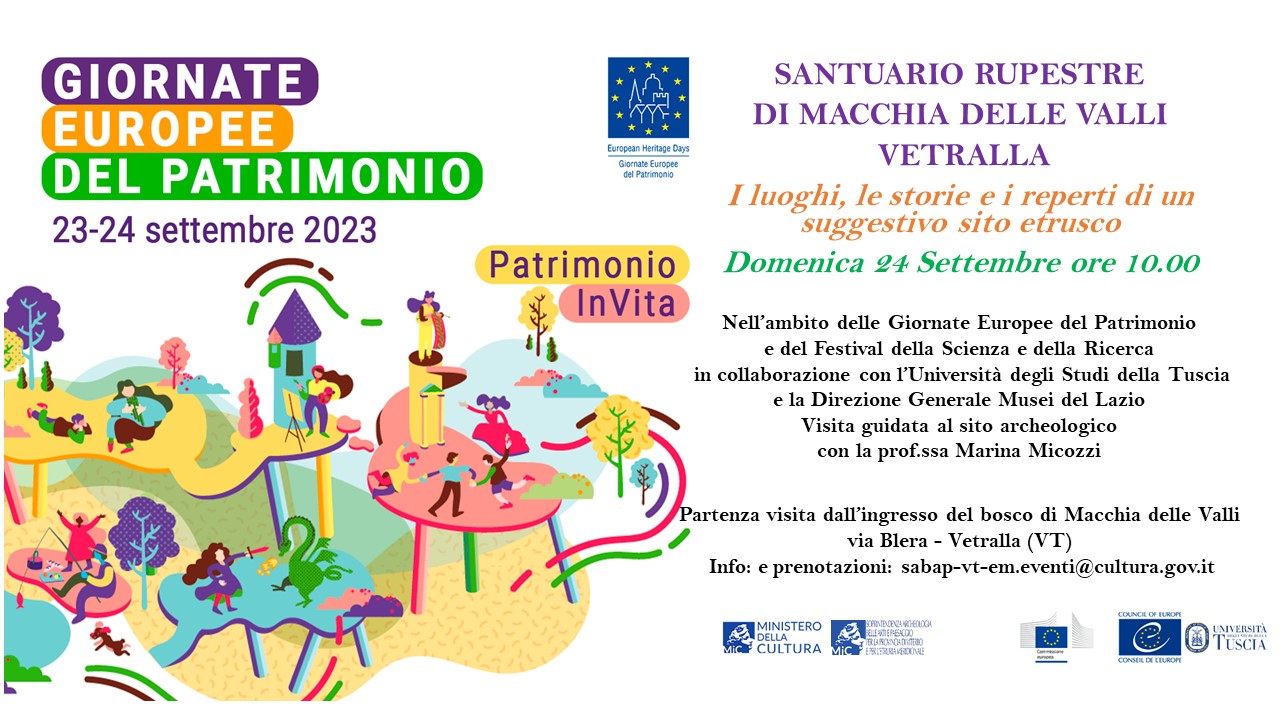 Tornano a Macchia delle Valli a Vetralla (VT) le Giornate Europee del Patrimonio, dedicate, nell’edizione 2023, al tema “Patrimonio in vita” e che quest’anno coincidono con il Festival della Scienza e della Ricerca. Domenica 24 settembre, alle ore 10.00, si potrà visitare il sito, guidati da Marina Micozzi, professoressa di Etruscologia dell’Università della Tuscia, e apprezzarne, per chi vorrà, gli straordinari reperti conservati nel Museo Nazionale Etrusco della Rocca Albornoz, grazie ad una iniziativa congiunta della Soprintendenza ABAP per la Provincia di Viterbo e l’Etruria meridionale, dell’Università della Tuscia e della Direzione Generale Musei del Lazio unite in un consolidato rapporto di collaborazione per la conoscenza, la tutela e la valorizzazione del patrimonio archeologico della Tuscia.