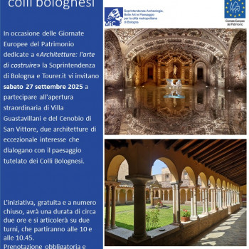 In occasione delle Giornate Europee del Patrimonio 2025 a tema Architetture: l’arte di costruire, la Soprintendenza ABAP per la città metropolitana di Bologna e Tourer.it vi invitano a partecipare all'apertura straordinaria della cinquecentesca Villa Guastavillani e dell'antichissimo Cenobio di San Vittore, due architetture di eccezionale interesse che dialogano con il paesaggio tutelato dei colli bolognesi. L’iniziativa è resa possibile dall’ospitalità offerta da Bologna Business School e dall’Associazione Culturale Cenobio San Vittore che la Soprintendenza ringrazia sentitamente.