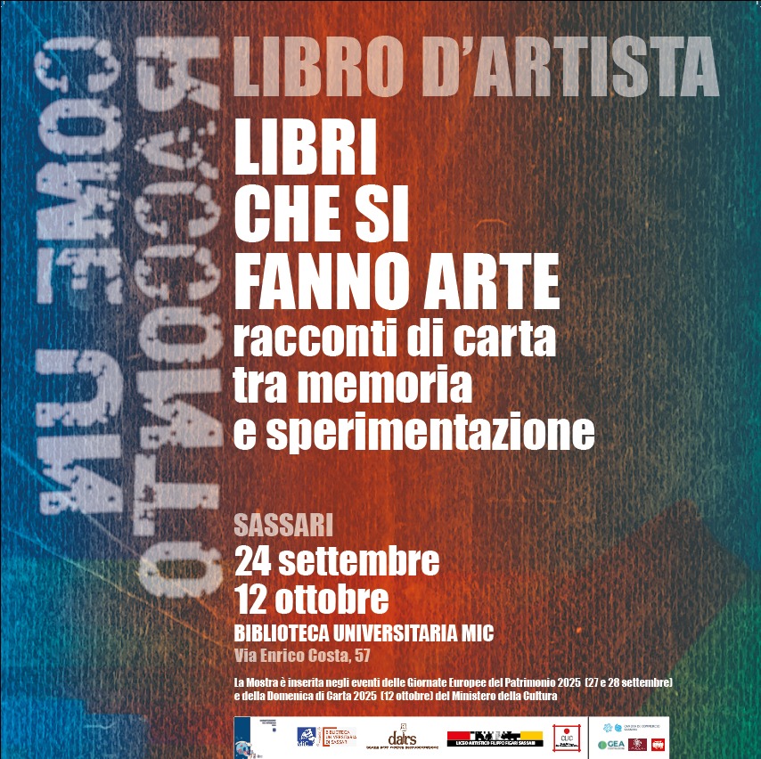 Da Sabato 27 Settembre dalle ore 16.30 sarà visitabile la Mostra “Libri d’artista” (organizzata in collaborazione con il DARS di Udine, il Liceo Artistico Figari di Sassari e l’Associazione Culturale CLIC). La mostra vuole raccontare i libri con l'arte, la poesia, la letteratura, la memoria. I libri, smettono di essere soltanto oggetti da leggere e diventano opere uniche, capaci di raccontare storie attraverso la materia stessa di cui sono fatti. La carta, il colore, le incisioni, le forme: tutto si trasforma in linguaggio artistico. In questo processo il libro diventa architettura, scultura, memoria, emozione. È l’incontro tra parola e gesto creativo, un passaggio in cui il libro si fa davvero arte. In mostra: le Accademie di Belle Arti di Bari, Bologna, Firenze, Foggia, Lecce, Palermo, Ravenna e Roma; la storica Facoltà di Belle Arti dell'Università Complutense di Madrid (Spagna) in progetto Erasmus+ con l'Accademia di Belle Arti di Venezia; i Licei Artistici “G.Sello” di Udine e “F. Figari” di Sassari; la Scuola di Arti Applicate di Fiume (Croazia).