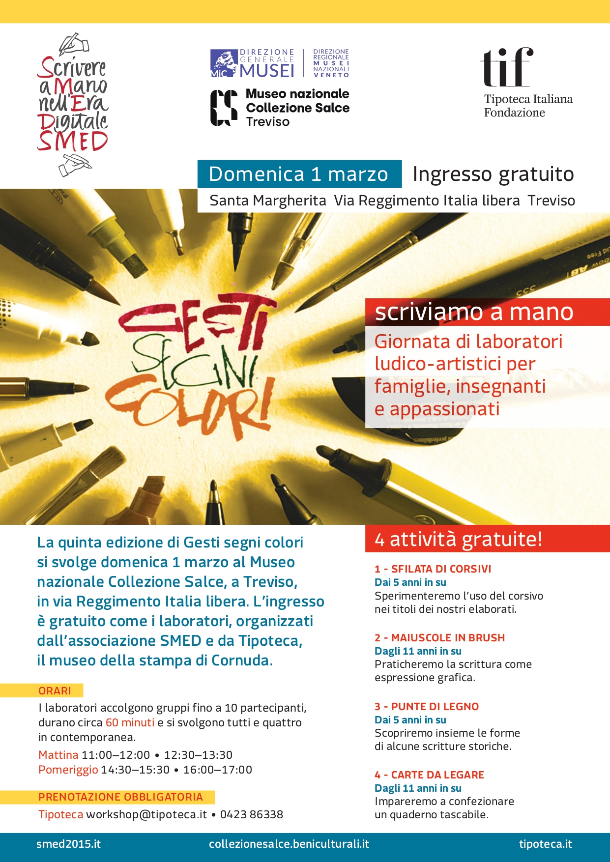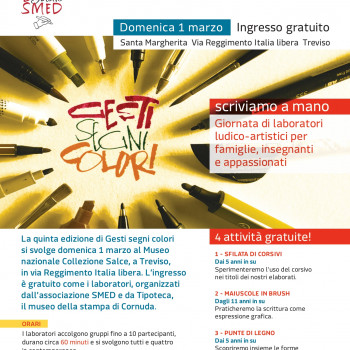 In occasione della Domenica al Museo con ingresso gratuito, il Museo nazionale Collezione Salce a Treviso ospita la quinta edizione di Gesti, segni, colori. Una giornata di laboratori ludico-artistici e incontri dedicati alla scrittura a mano, ideata dall’Associazione SMED (Scrivere a mano nell’Era Digitale) in collaborazione con Tipoteca, Il Museo della Stampa e del Design Grafico.