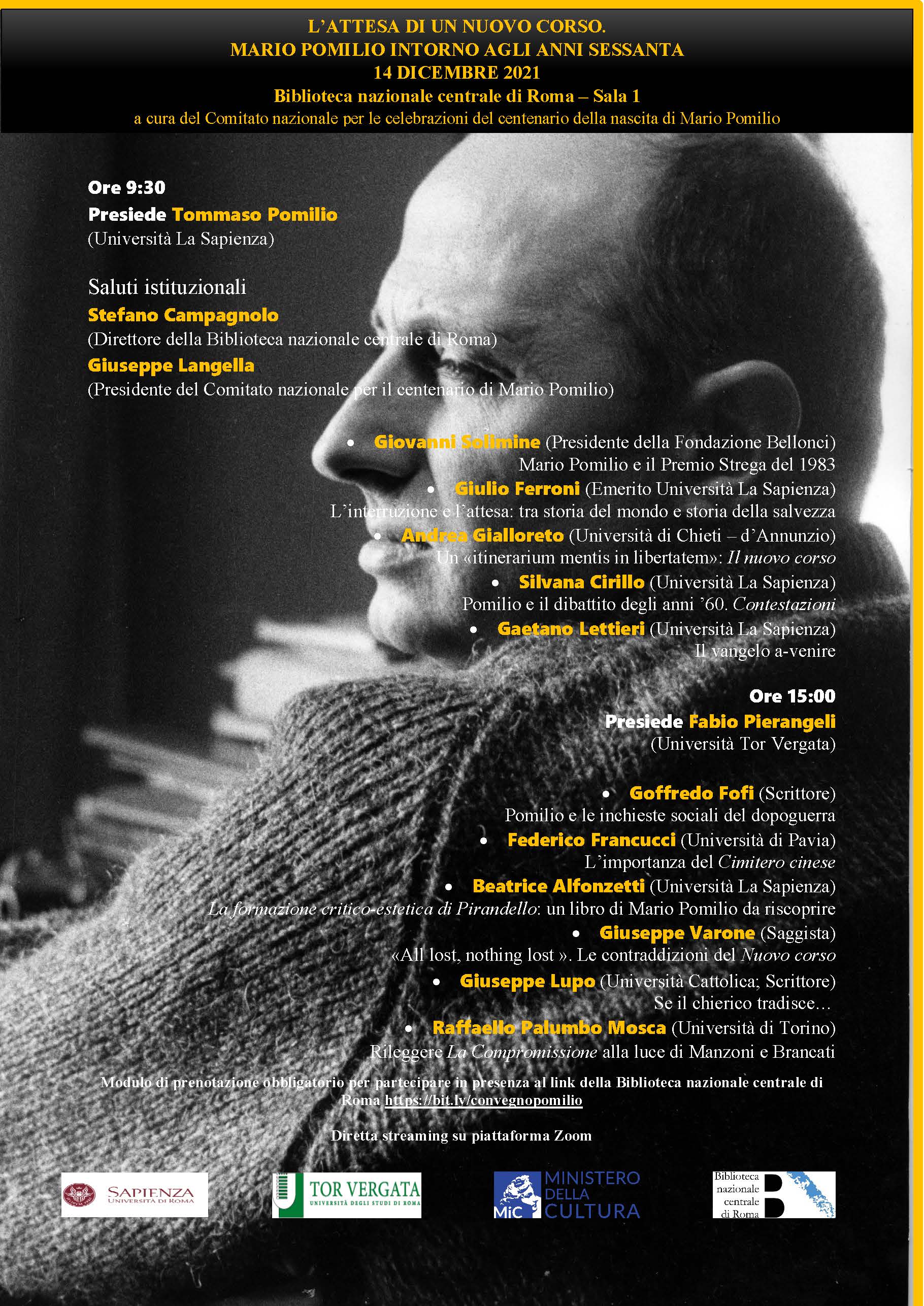 Con la Giornata di studi L’attesa di un nuovo corso, s’inaugurano le celebrazioni del Centenario della nascita di Mario Pomilio, patrocinate dal Ministero della Cultura assieme a sette istituzioni universitarie italiane, costituitesi in Comitato (presidente il Prof. Giuseppe Langella): Università di Napoli Federico II, Università Suor Orsola Benincasa di Napoli, Università Cattolica di Milano, Università di Pavia, Università d’Annunzio di Chieti-Pescara, oltre che Sapienza e Tor Vergata, organizzatrici dell’evento romano nella persona dei curatori Fabio Pierangeli e Tommaso Pomilio.