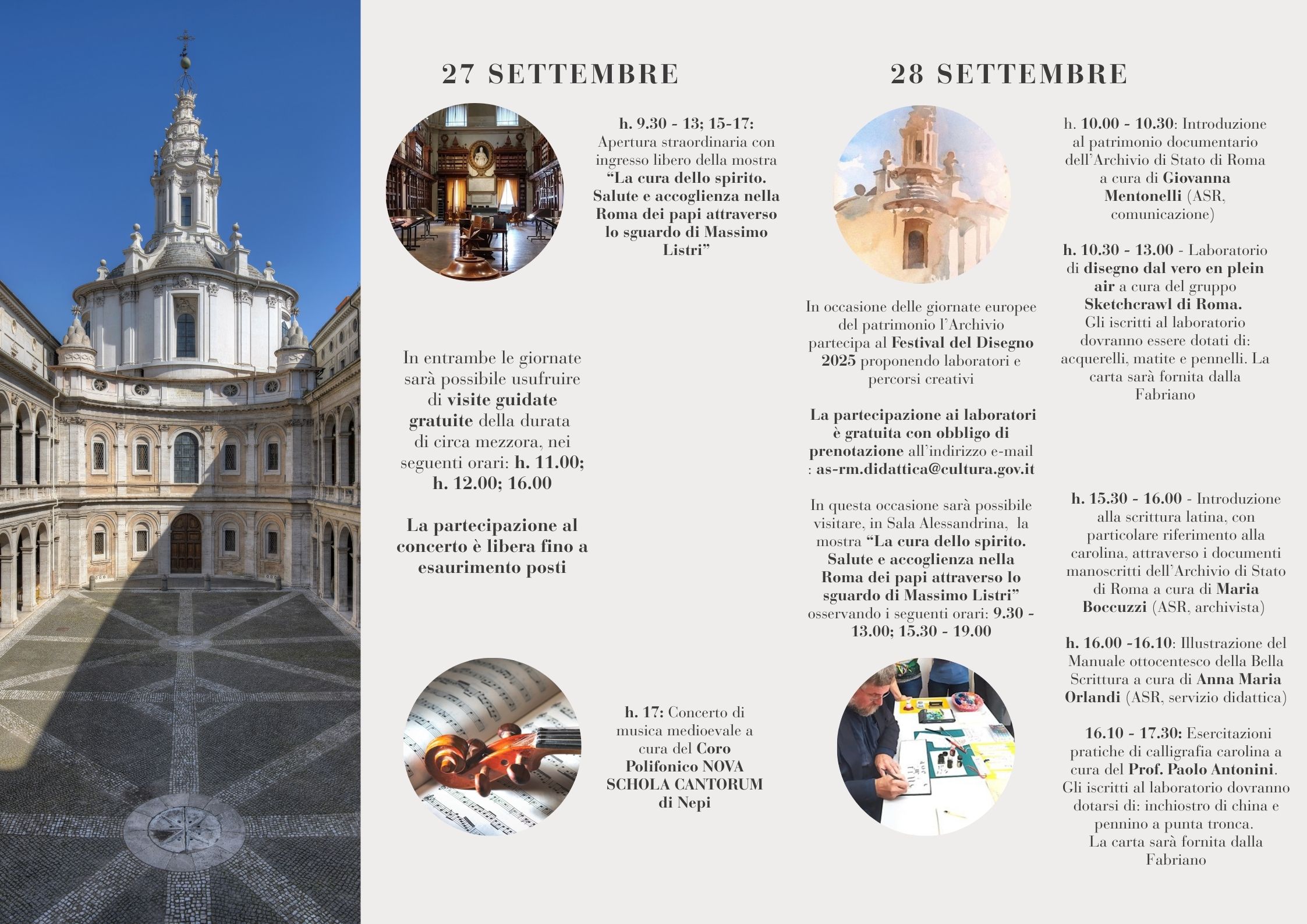 - la mostra La cura dello spirito. salute e accoglienza nella Roma dei papi attraverso lo sguardo di Massimo Listri. L’esposizione propone un viaggio nella storia dell’assistenza sanitaria e dell’accoglienza nella Roma pontificia, attraverso un inedito dialogo tra fotografie d’autore e documenti d’archivio. La storia millenaria degli ospedali romani, raccontata nei documenti custoditi dall’Archivio di Stato di Roma – codici miniati, disegni, cronache, statuti e libri di preghiere – si rispecchia negli scatti – silenti e armonici – di queste architetture dedicate nel tempo alla cura della salute fisica e spirituale e oggi rinnovate dai sapienti restauri svolti dalla Soprintendenza Speciale di Roma. La mostra sarà visitabile gratuitamente sabato 27 settembre negli orari 9.30-13 e 15-17, domenica 28 settembre negli orari 9.30-13 e 15.30-19.In entrambe le giornate sarà possibile usufruire di viste guidate della durata di circa mezz’ora nei seguenti orari: h. 11, h. 12, h. 16. Ingresso libero