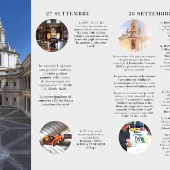 - 28/9: ore 10-13, Viaggio tra le carte, disegni e piante in Archivio. Disegno dal vero en plein air a cura del gruppo Sketchcrawl Roma