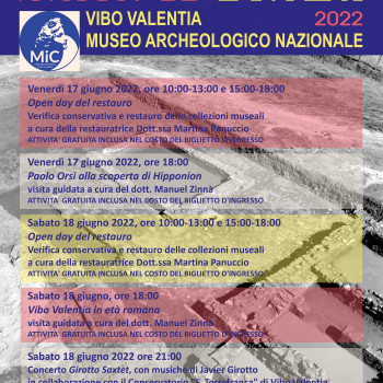 Il programma proposto dal Museo prevede anche lo svolgimento di due differenti percorsi guidati, alle ore 18:00 di venerdì 17 giugno e alle ore 18:00 di sabato 18 giugno, realizzati grazie al prezioso contributo dell’Associazione culturale “Mnemosyne”. Il primo, dal titolo ‘Paolo Orsi alla scoperta di Hipponion’, sarà dedicato all’attività vibonese del grande archeologo trentino, scopritore della monumentale cinta muraria del trappeto Vecchio e degli edifici templari del Cofino e del Belvedere-Telegrafo; il secondo, dal titolo ‘Vibo Valentia in età romana’, sarà finalizzato ad illustrare ai visitatori uno dei periodi storici più importanti per la città di Vibo Valentia, una delle 7 città più ricche d’Italia ai tempi dell’imperatore Augusto. Entrambi i percorsi saranno curati dall’archeologo Manuel Zinnà.