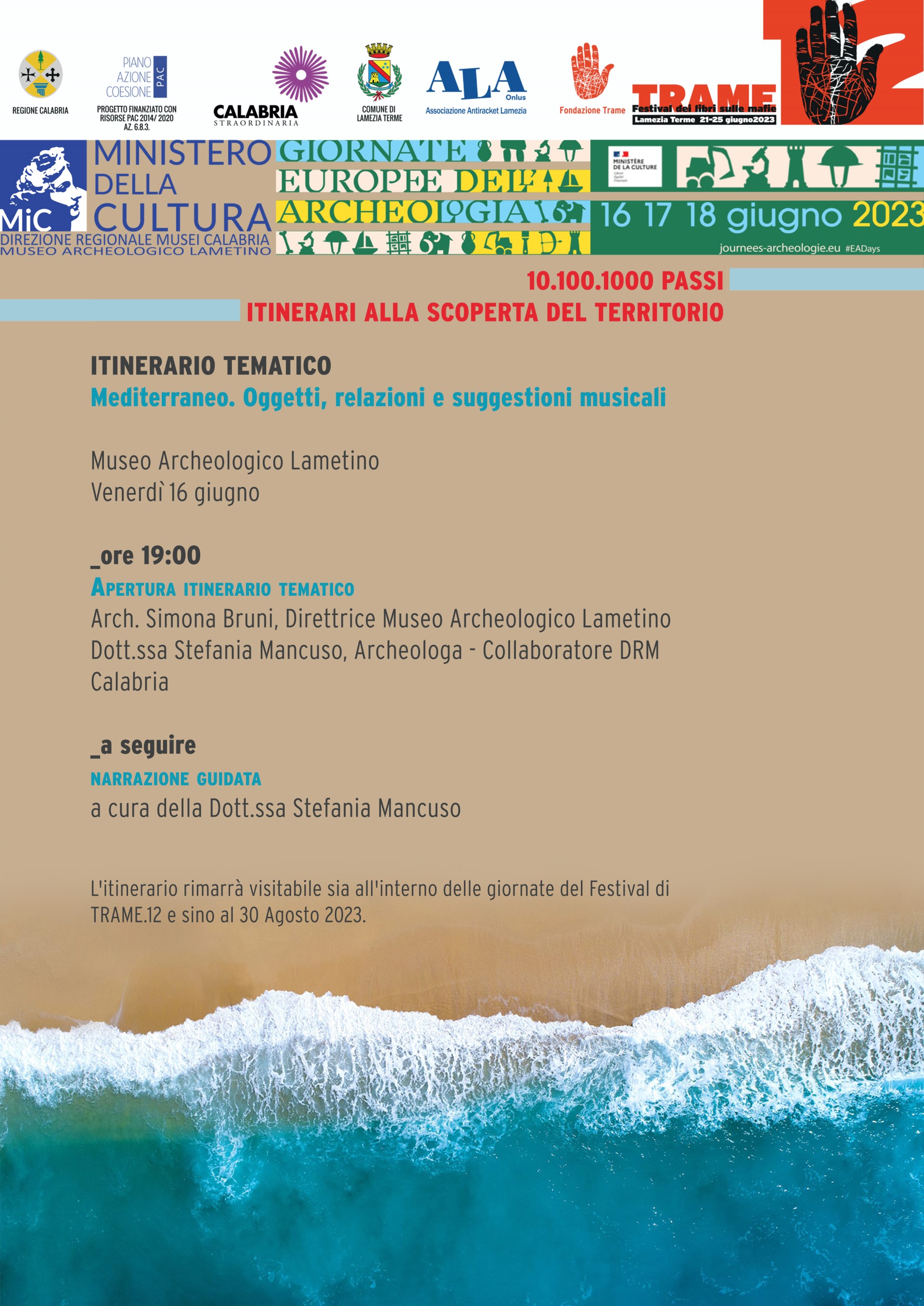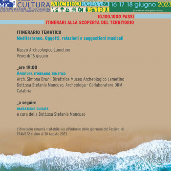 Per la sezione 10.100.1000 PASSI. ITINERARI ALLA SCOPERTA DEL TERRITORIO il Museo archeologico Lametino presenta l'itinerario "Mediterraneo. Oggetti, relazioni e suggestioni musicali" con una selezione di reperti, alcuni dei quali mai esposti sino ad ora, legati al tema del Mediterraneo.