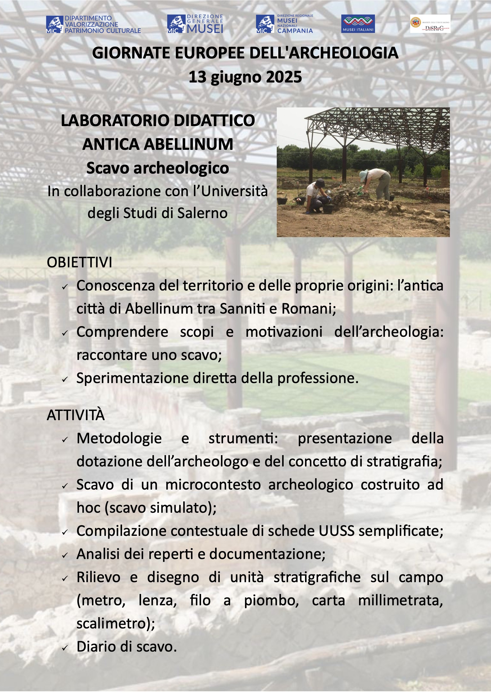 Giornate Europee dell'Archeologia 2025 - Laboratorio didattico di scavo archeologico "Antica Abellinum" in collaborazione con il DiSPaC dell'Università degli Studi di Salerno - 13 giugno 2025