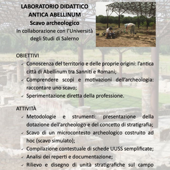 I laboratori didattici, modulabili in base all’età dei bambini e dei ragazzi a cui sono rivolti (dalle scuole elementari alle superiori), si articoleranno in attività di simulazione di uno scavo archeologico, rilievo, documentazione di reperti e, a seconda dei casi, riproduzione di intonaci e decorazioni antiche, accompagnate ad una visita guidata all’Area archeologica dell’Antica Abellinum.