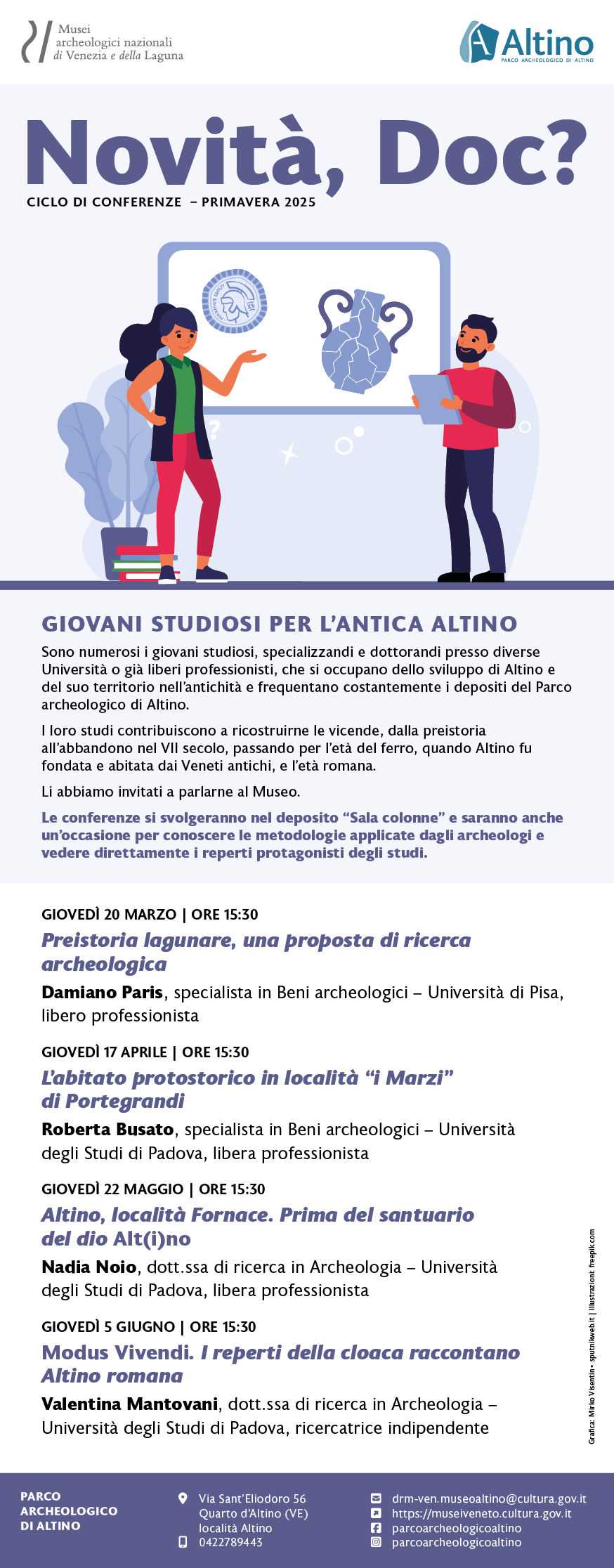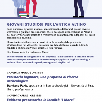 A cadenza mensile, ti racconteranno le vicende del territorio altinate dalla preistoria all’abbandono nel VIII secolo d.C., presentando reperti e metodologie applicate nei loro studi.