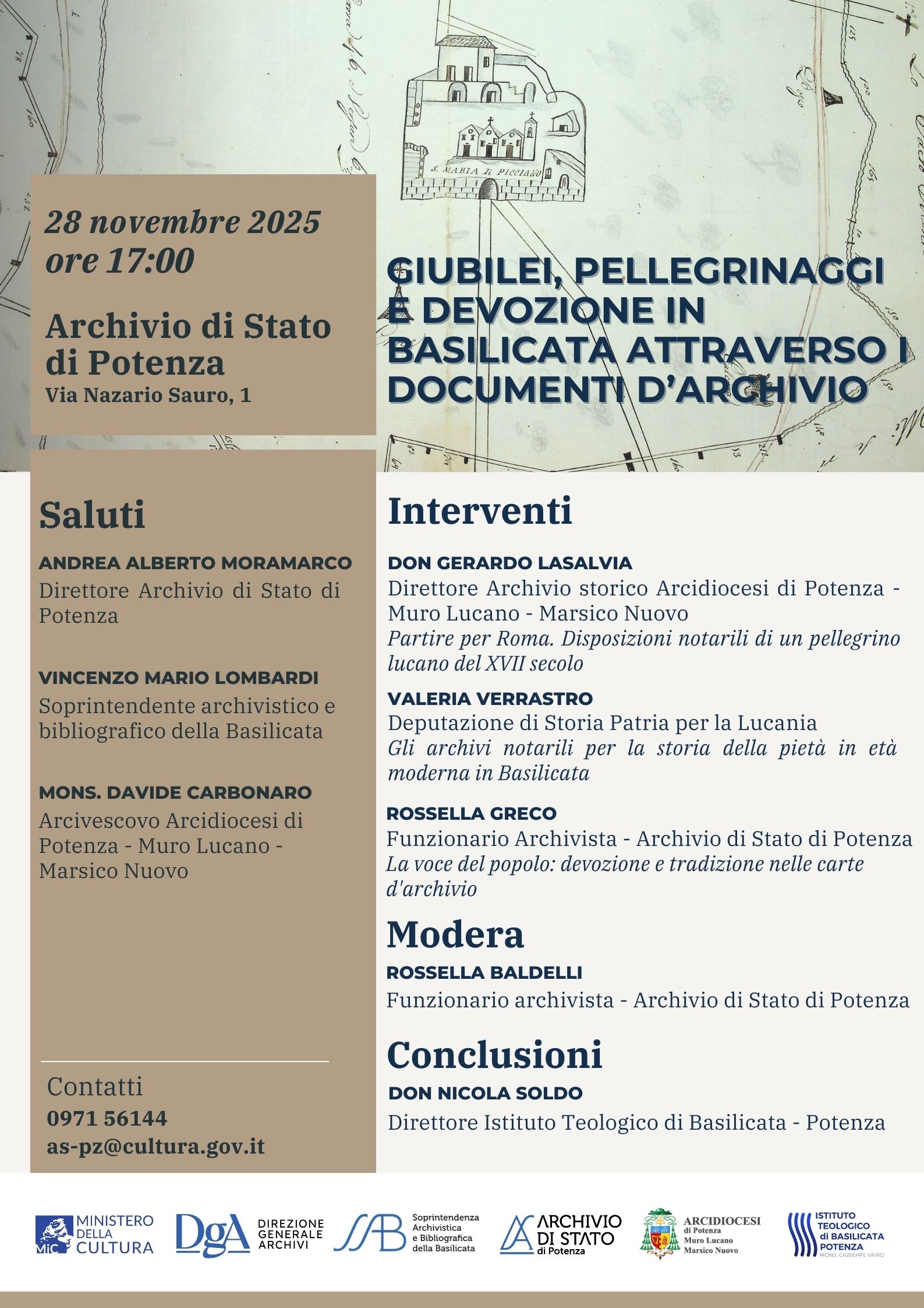L’incontro sarà introdotto dai saluti di Andrea Alberto Moramarco, Direttore dell’Archivio di Stato di Potenza, di Vincenzo Mario Lombardi, Soprintendente archivistico e bibliografico della Basilicata, e di Mons. Davide Carbonaro, Arcivescovo dell’Arcidiocesi di Potenza–Muro Lucano–Marsico Nuovo.