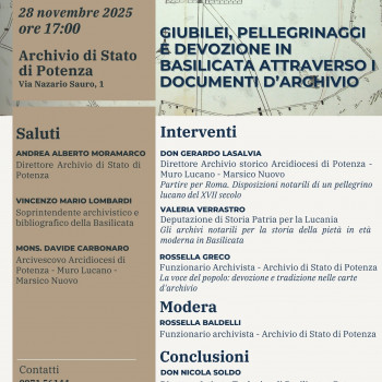 L’Archivio di Stato di Potenza organizza l’incontro “Giubilei, pellegrinaggi e devozione in Basilicata attraverso i documenti d’archivio”, che si terrà venerdì 28 novembre 2025 alle ore 17:00 presso la sede di via Nazario Sauro, 1.