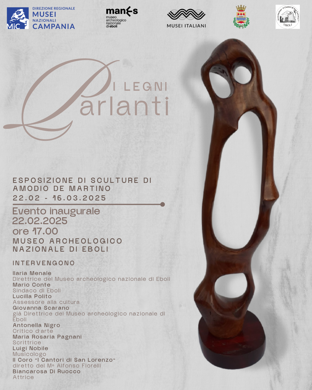 Sabato 22 febbraio alle ore 17.00 il ManES – Museo archeologico nazionale di Eboli, in collaborazione con l’Associazione “I Cantori di San Lorenzo”, inaugura l’esposizione I Legni parlanti di Amodio De Martino.