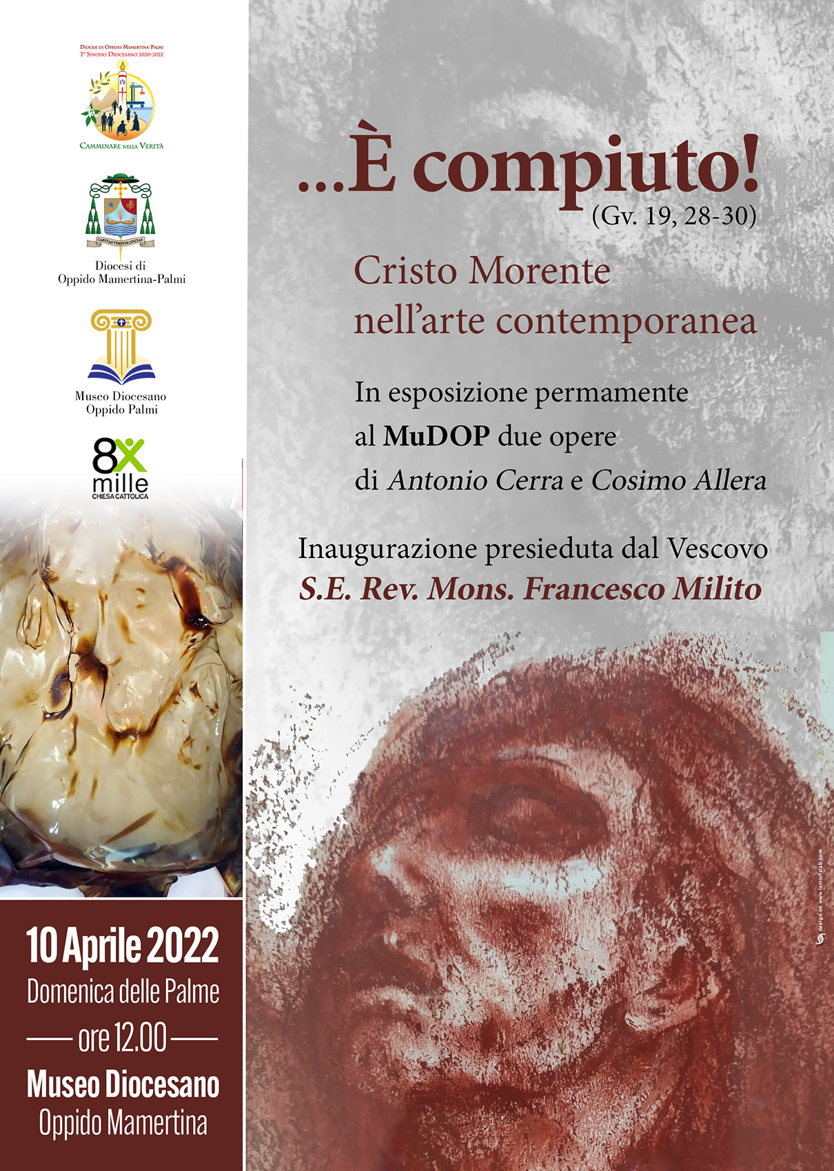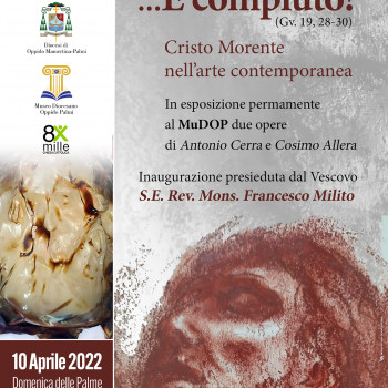 In un giorno speciale e carico di una fortissima valenza simbolica, domenica 10 aprile, Domenica delle Palme, il MuDOP - Museo diocesano di Oppido- Palmi, inaugura "E’ Compiuto (Gv 19,28-30)- Cristo Morente nell’arte contemporanea". Alla presenza di Mons. Francesco Milito, vescovo della diocesi di Oppido-Palmi, saranno donate due opere che arricchiranno le collezioni permanenti del MuDOP e costituiranno, nel contempo, il primo nucleo della sezione del Museo dedicata all'arte contemporanea: