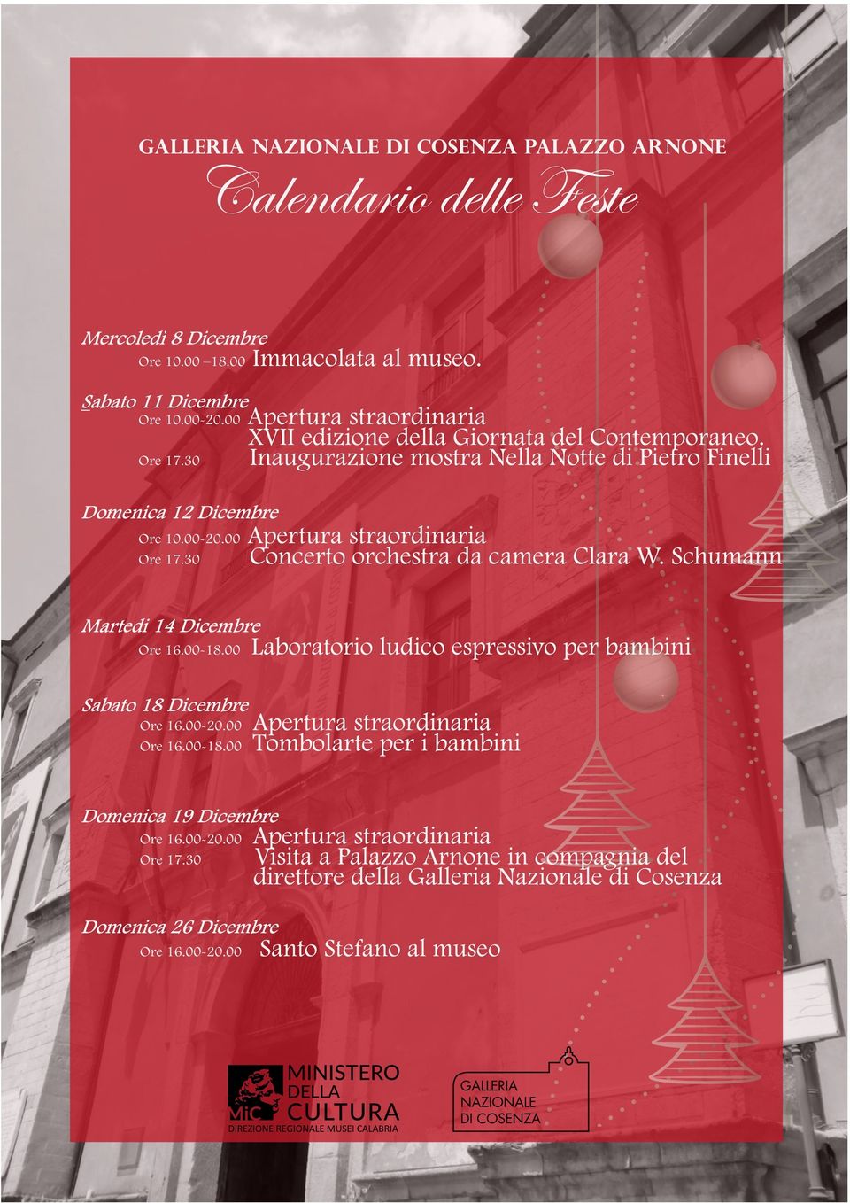 Un ricchissimo carnet di eventi scandisce il mese di dicembre alla Galleria nazionale di Cosenza: aperture straordinarie, visite guidate, concerti, momenti ludici e attività laboratoriali nel segno dell'arte e della cultura, ma con un occhio attento ad un approccio giocoso per tutti, grandi e piccini, così come le festività natalizie richiedono-