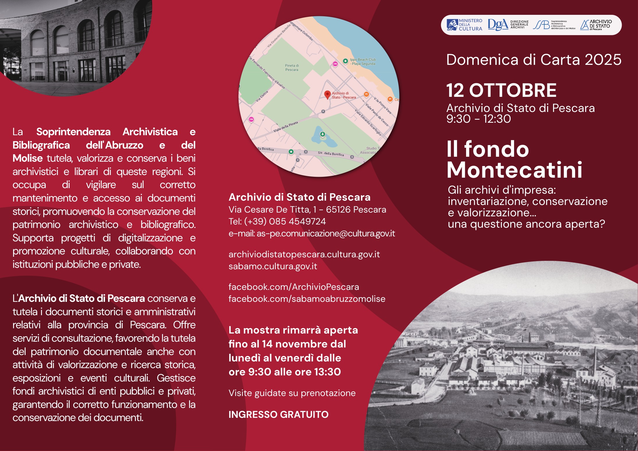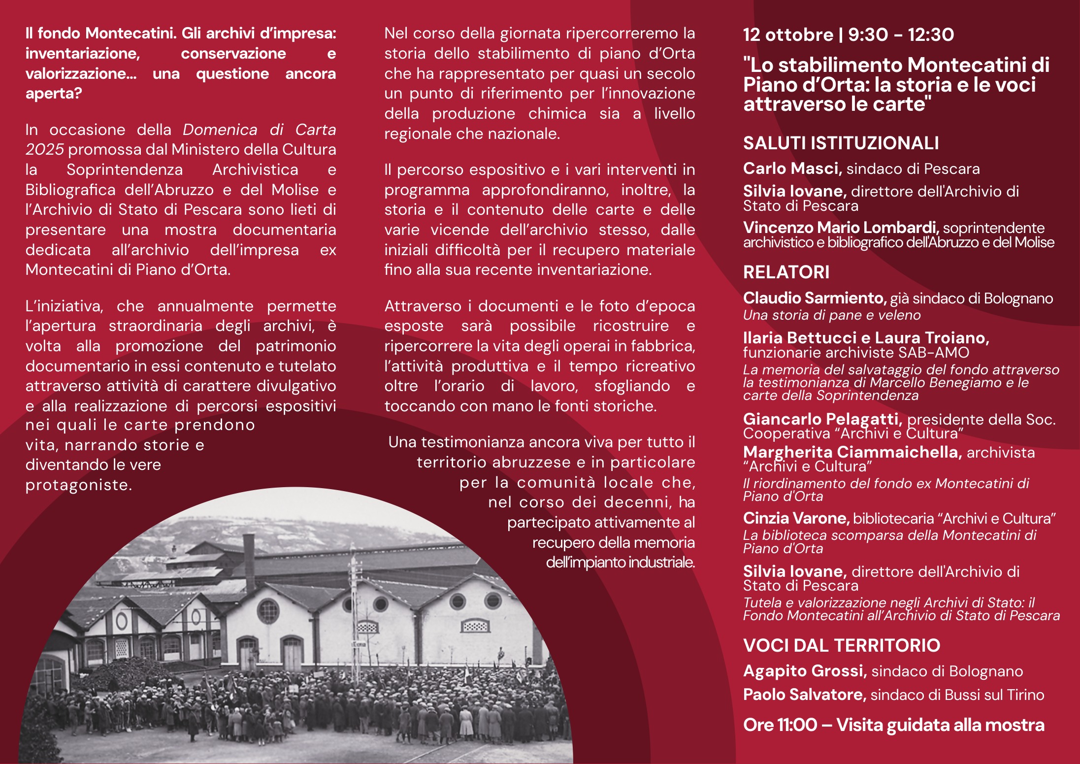 In occasione della Domenica di Carta 2025, iniziativa promossa dalla Direzione generale Archivi del Ministero della Cultura (MiC), la Soprintendenza Archivistica e Bibliografica dell’Abruzzo e del Molise e l’Archivio di Stato di Pescara presentano “Il fondo Montecatini. Gli archivi d’impresa: inventariazione, conservazione e valorizzazione… una questione ancora aperta?”, una mostra documentaria dedicata all’archivio dell’impresa ex Montecatini di Piano d’Orta (PE).