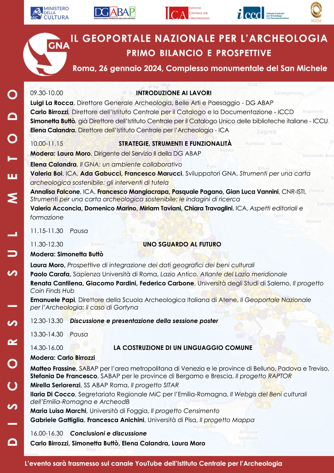 Secondo il programma della giornata, l’introduzione ai lavori è affidata al Direttore Generale Archeologia, Belle Arti e Paesaggio Luigi La Rocca e ai Direttori degli Istituti centrali con i quali l’ICA si è rapportato, ossia l’Istituto Centrale per il Catalogo Unico delle biblioteche italiane (ICCU), rappresentato dall’allora Direttore Simonetta Buttò, e l’Istituto Centrale per il Catalogo e la Documentazione (ICCD), diretto da Carlo Birrozzi. All’ICCU il GNA deve l’accordo con PIN – Vast Lab e CNR-ISTI, mentre l’ICCD ha fornito gli standard per la raccolta dei dati.