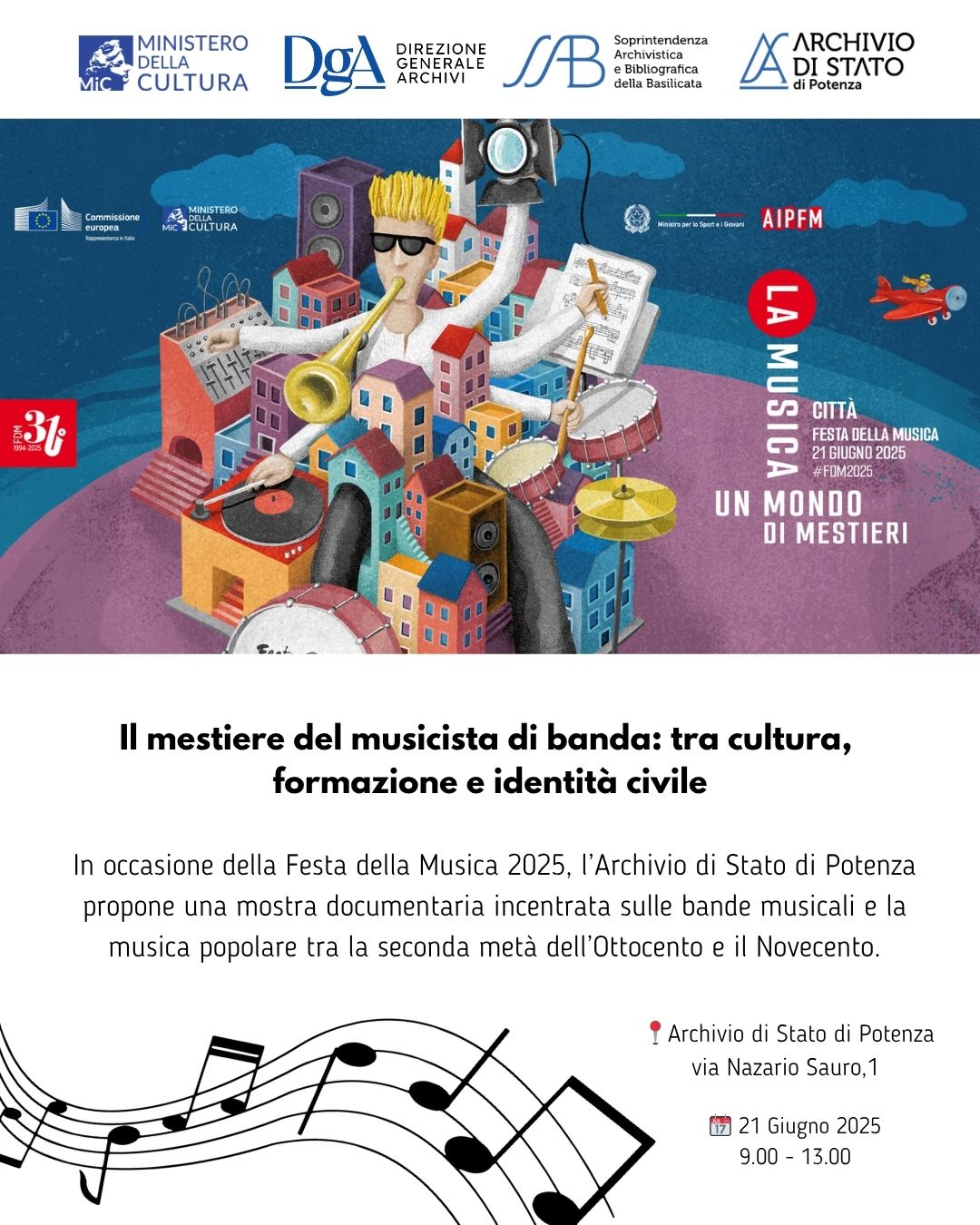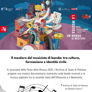 In occasione della Festa della Musica 2025, l’Archivio di Stato di Potenza propone la mostra documentaria "Il mestiere del musicista di banda: tra cultura, formazione e identità civile" incentrata sulle bande musicali e la musica popolare tra la seconda metà dell’Ottocento e il Novecento.