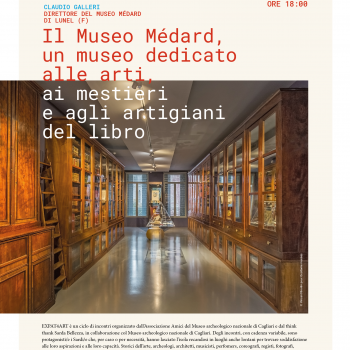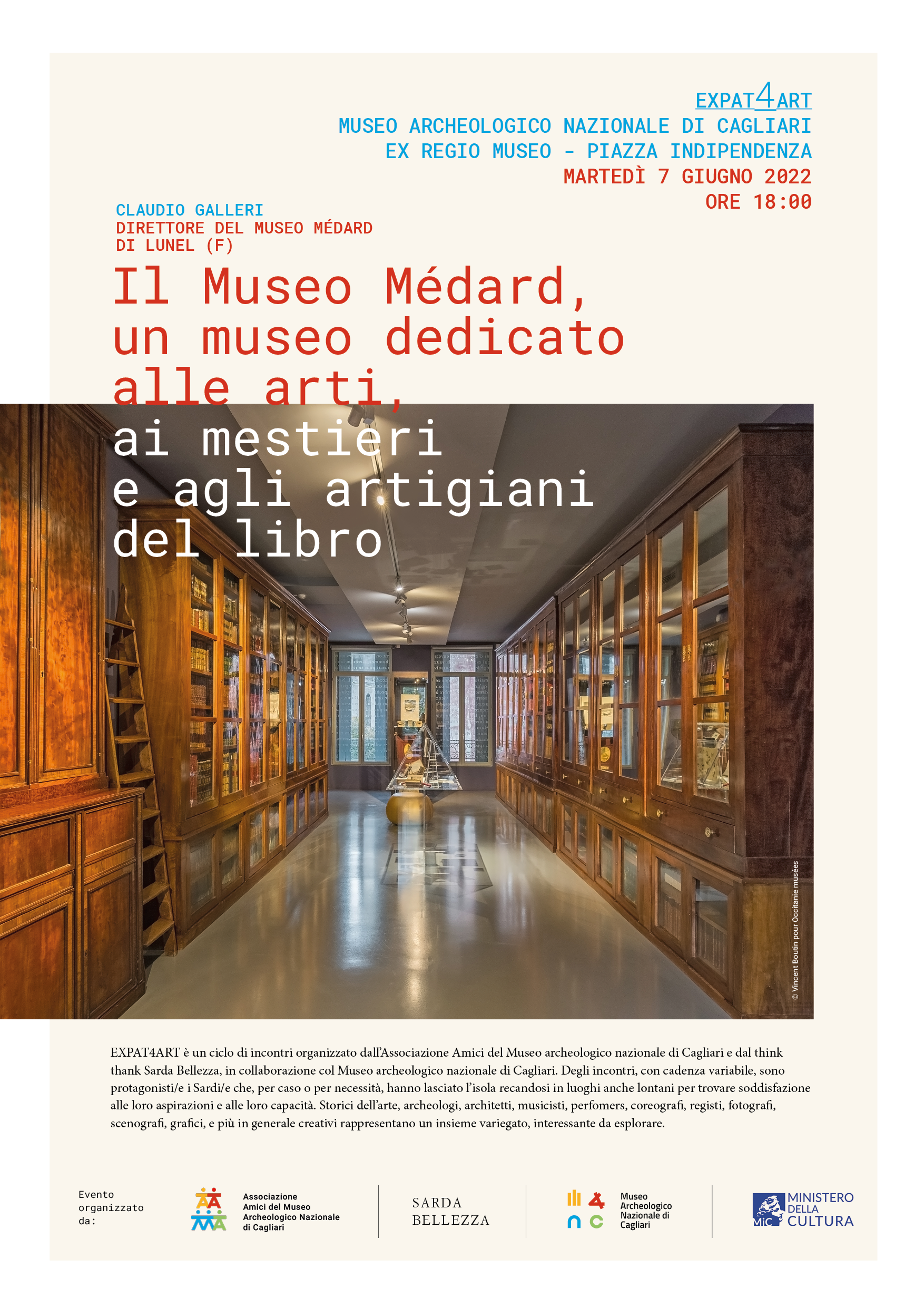 Martedì 7 giugno alle ore 18:00 presso l’ex Regio Museo in piazza Indipendenza il Museo Archeologico Nazionale di Cagliari proporrà un nuovo appuntamento del ciclo EXPAT4ART promosso dall’Associazione Amici del Museo Archeologico Nazionale di Cagliari e dal think tank Sarda Bellezza.Protagonista della serata sarà Claudio Galleri, Direttore del Museo Médard di Lunel in Francia, che presenterà l’incontro dal titolo “Il Museo Médard, un museo dedicato alle arti, ai mestieri e agli artigiani del libro”.Il Museo Médard conserva dal 2013, il patrimonio del bibliofilo Louis Mèdard (1768-1841) con circa 5000 opere rare e preziose comprendenti anche manoscritti medievali.EXPAT4ART è un ciclo di incontri dedicato all’arte, in cui i protagonisti saranno storici dell’arte, archeologi, architetti, musicisti, performers sardi che, per caso o per necessità, hanno lasciato l’isola recandosi in luoghi anche lontani per trovare soddisfazione alle loro aspirazioni e alle loro capacità.