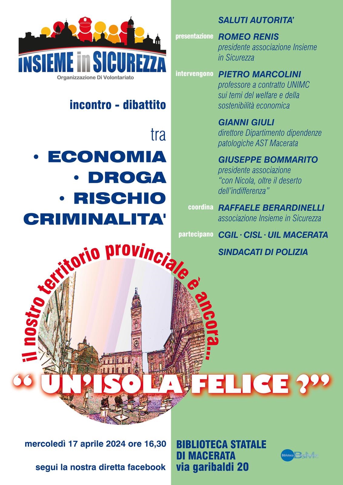 La Biblioteca Statale di Macerata in collaborazione con L’Associazione “Insieme in Sicurezza” di Macerata, mercoledì 17 aprile 2024 alle ore 16.30, organizza un incontro dibattito sul tema: Tra economia, droga, rischio criminalità, il nostro territorio provinciale è ancora… “un’isola felice?”. Presentazione di Romeo Renis, intervengono Pietro Marcolini, Gianni Giuli e Giuseppe Bommarito, coordina Raffaele Berardinelli e partecipano CGIL, CISL, UIL Macerata Sindacati di Polizia.