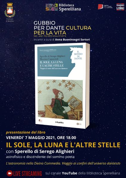 Presentazione del libro “Il sole, la luna e l’altre stelle. Viaggio al centro dell’universo dantesco” di Sperello di Serego Alighieri e Massimo Capaccioli, edito nella collana “Il mondo di Dante” da La Repubblica. Sperello di Serego Alighieri, astrofisico e discendente del sommo poeta, ne parlerà con Anna Buoninsegni Sartori in diretta streaming sul canale della YouTube della Biblioteca Comunale Sperelliana di Gubbio.