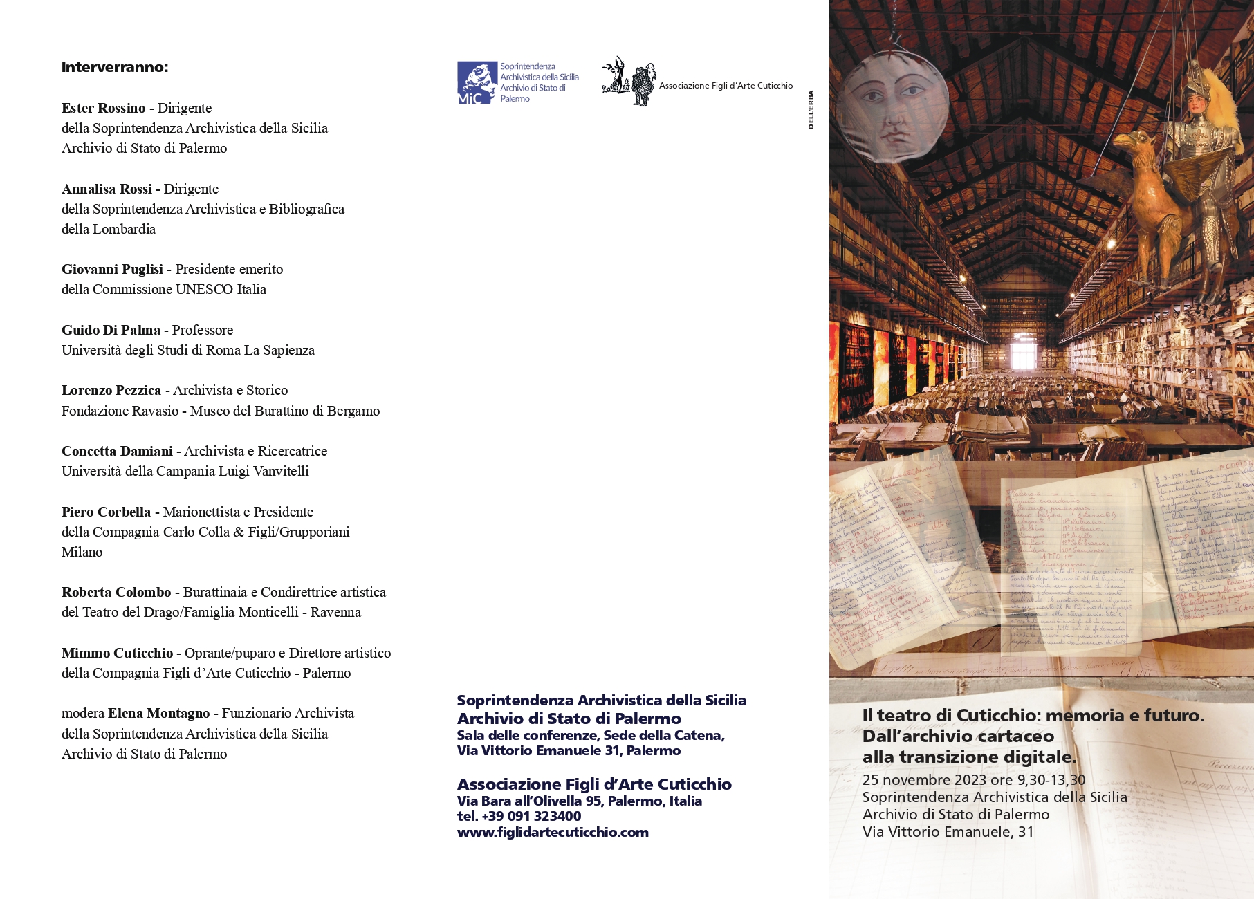 La Soprintendenza Archivistica della Sicilia-Archivio di Stato di Palermo celebrerà il decennale del riconoscimento d’interesse culturale dell’archivio raccolto dal Maestro Mimmo Cuticchio con l’iniziativa dal titolo “Il teatro di Cuticchio: memoria e futuro. Dall’archivio cartaceo alla transizione digitale”. Il convegno, realizzato in collaborazione con l’Associazione figli d’Arte Cuticchio, si terrà sabato 25 novembre (ore 9,30 -13,30) presso la sede Catena dell’Archivio di Stato. L’iniziativa rientra fra le Aperture straordinarie dei luoghi della cultura indette dal Ministero della Cultura nell’ambito del Piano di valorizzazione 2023.