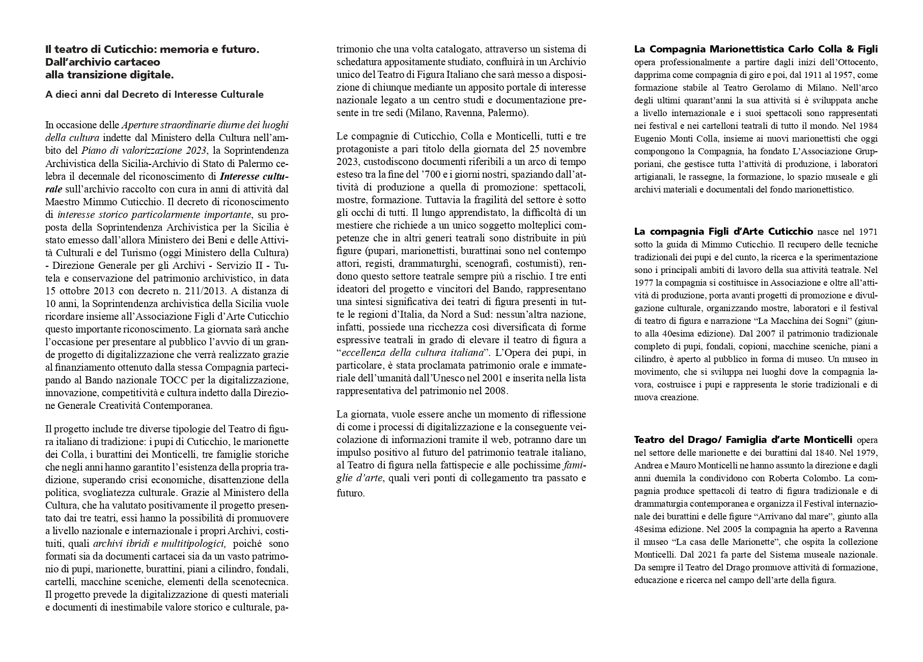 Grazie al Ministero della Cultura, i tre teatri coinvolti hanno la possibilità di promuovere a livello nazionale e internazionale i propri archivi, formati sia da documenti cartacei sia da un vasto patrimonio di pupi, marionette, burattini, piani a cilindro, fondali, cartelli, macchine sceniche, elementi della scenotecnica.