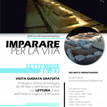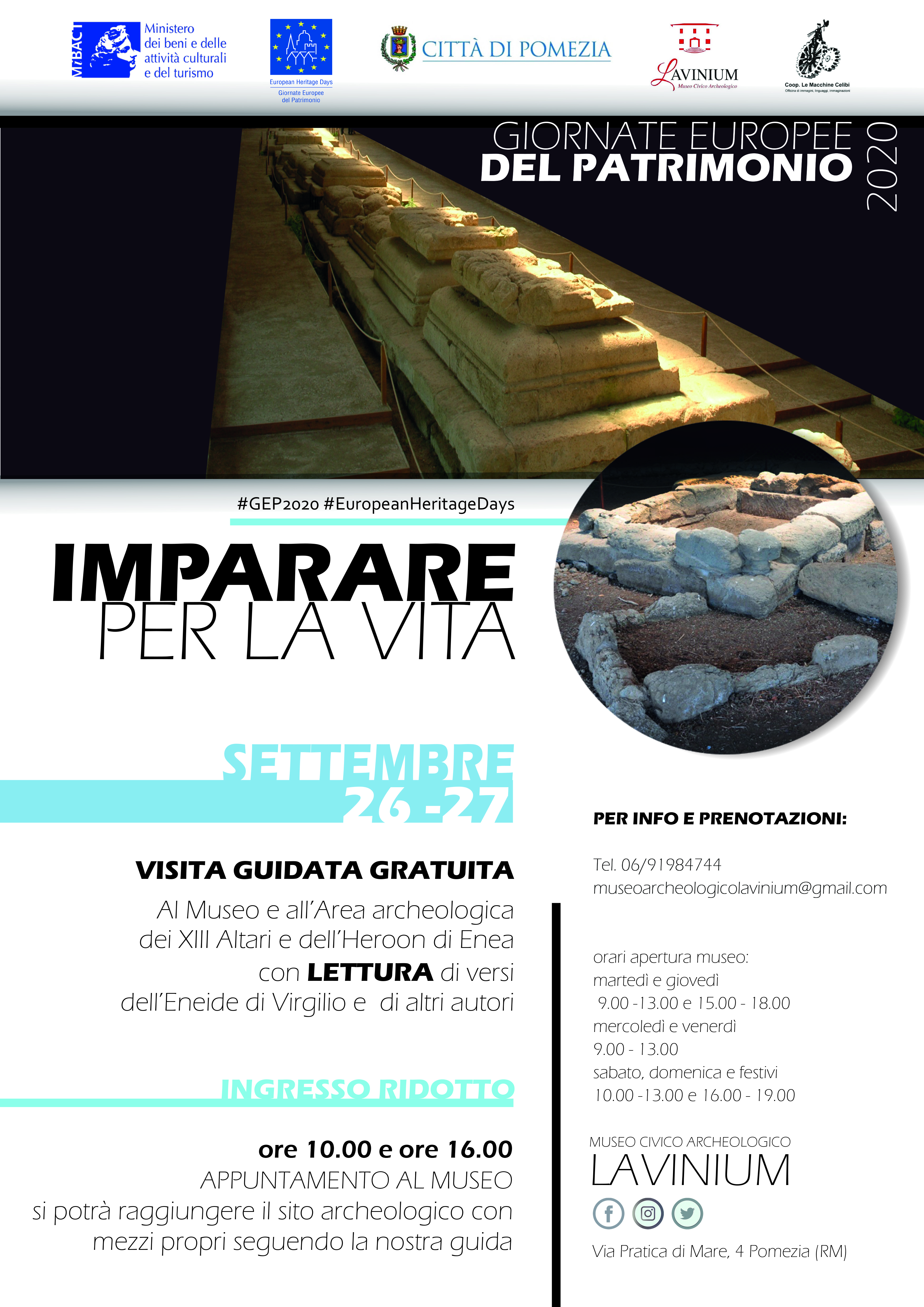 Sabato 26 e domenica 27 Settembre il Museo Civico Archeologico Lavinium per l’evento Imparare per la Vita incluso nel programma delle Giornate Europee del Patrimonio 2020, accoglierà i suoi visitatori con un biglietto integrato (valido per visitare sia il museo stesso che l’area archeologica) ad ingresso ridotto.