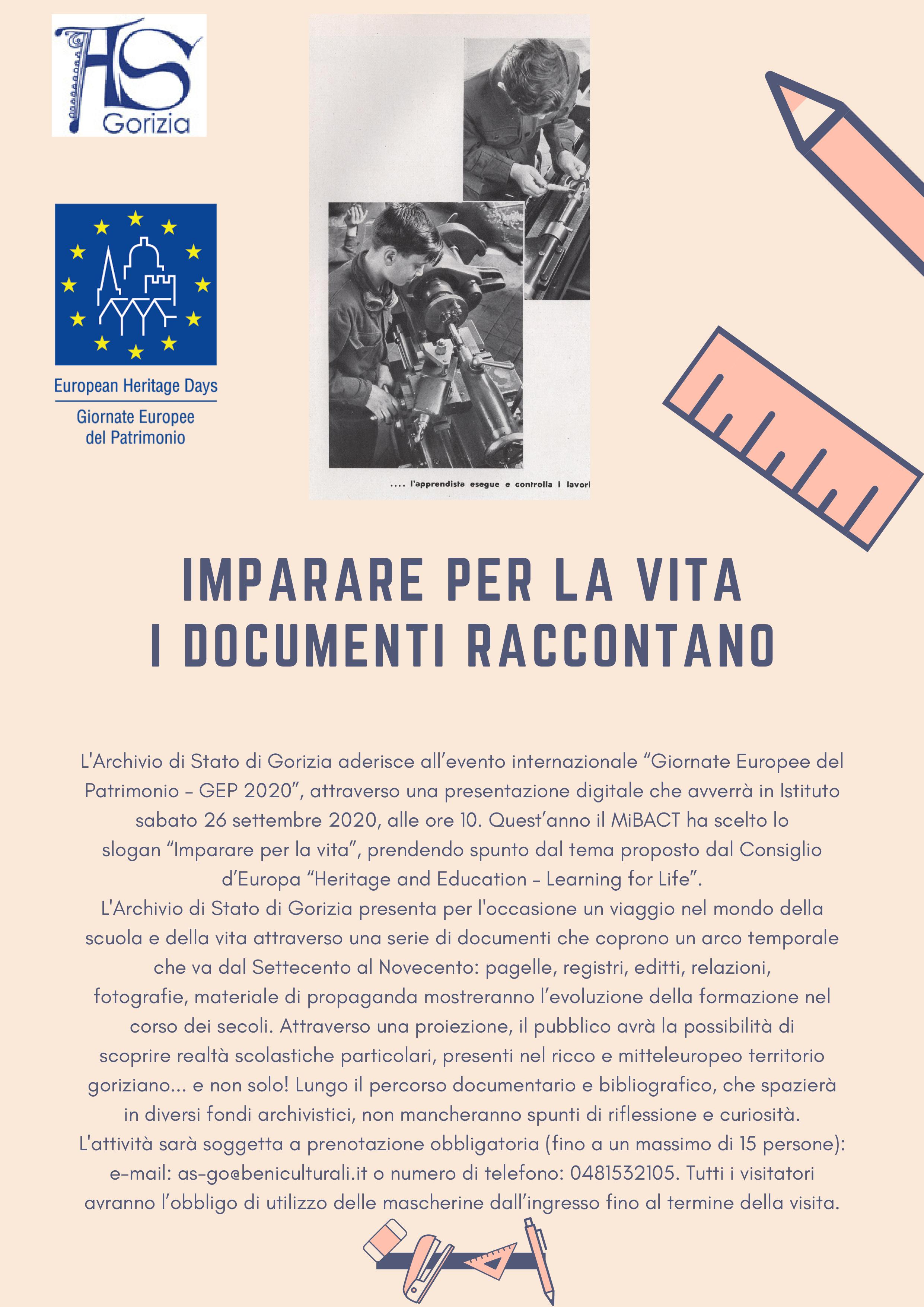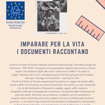 L'Archivio di Stato di Gorizia aderisce all’evento internazionale “Giornate Europee del Patrimonio – GEP 2020”, attraverso una presentazione digitale che avverrà in Istituto sabato 26 settembre 2020, alle ore 10. Quest’anno il MiBACT ha scelto lo slogan “Imparare per la vita”, prendendo spunto dal tema proposto dal Consiglio d’Europa “Heritage and Education – Learning for Life”.