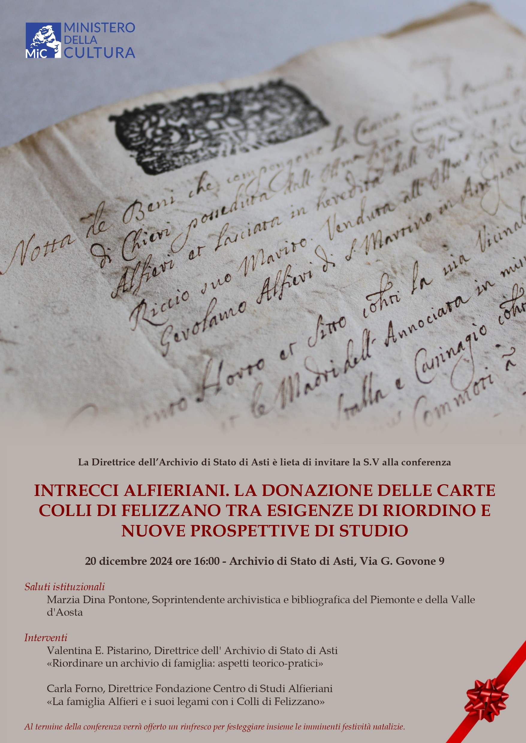Il giorno 20 dicembre alle ore 16:00 l'Archivio di Stato di Asti organizza la conferenza "Intrecci alfieriani. La donazione delle carte Colli di Felizzano tra esigenze di riordino e nuove prospettive di studio".
