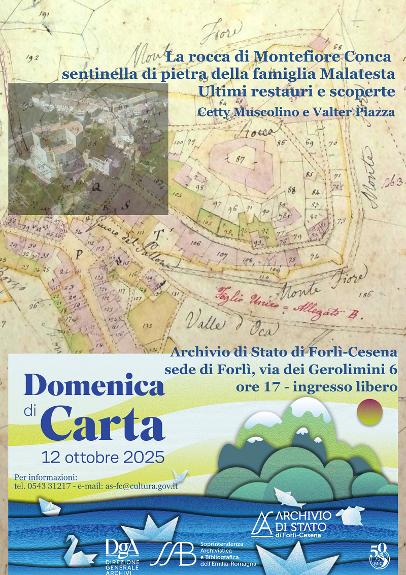 In occasione della Domenica di Carta 2025, domenica 12 ottobre alle ore 17, presso la sede di Forlì dell'Archivio di Stato di Forlì-Cesena, si terrà l'incontro La rocca di Montefiore Conca sentinella di pietra della famiglia Malatesta. Ultimi restauri e scoperte, a cura dell'architetto Valter Piazza e della storica dell'arte Cetty Muscolino, nel corso del quale saranno illustrati gli aspetti storici, architettonici, pittorici, decorativi e archeologici, che hanno caratterizzato un cantiere di restauro, vissuto come occasione di ricerca e opportunità di conoscenza.