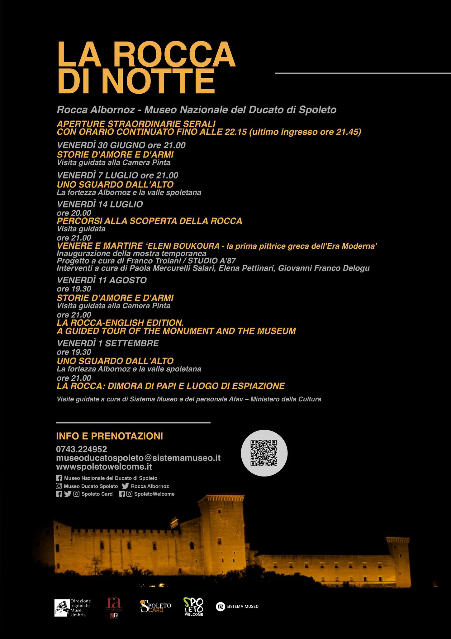 In occasione delle aperture serali straordinarie della Rocca Albornoz-Museo Nazionale del Ducato di Spoleto, in programma venerdì 30 giugno, 7 e 14 luglio, 11 agosto e 1 settembre 2023, con orario continuato fino alle 22:15, la Direzione Regionale dei Musei dell'Umbria, in collaborazione con Sistema Museo, presenta un programma di eventi e visite guidate.