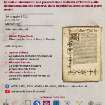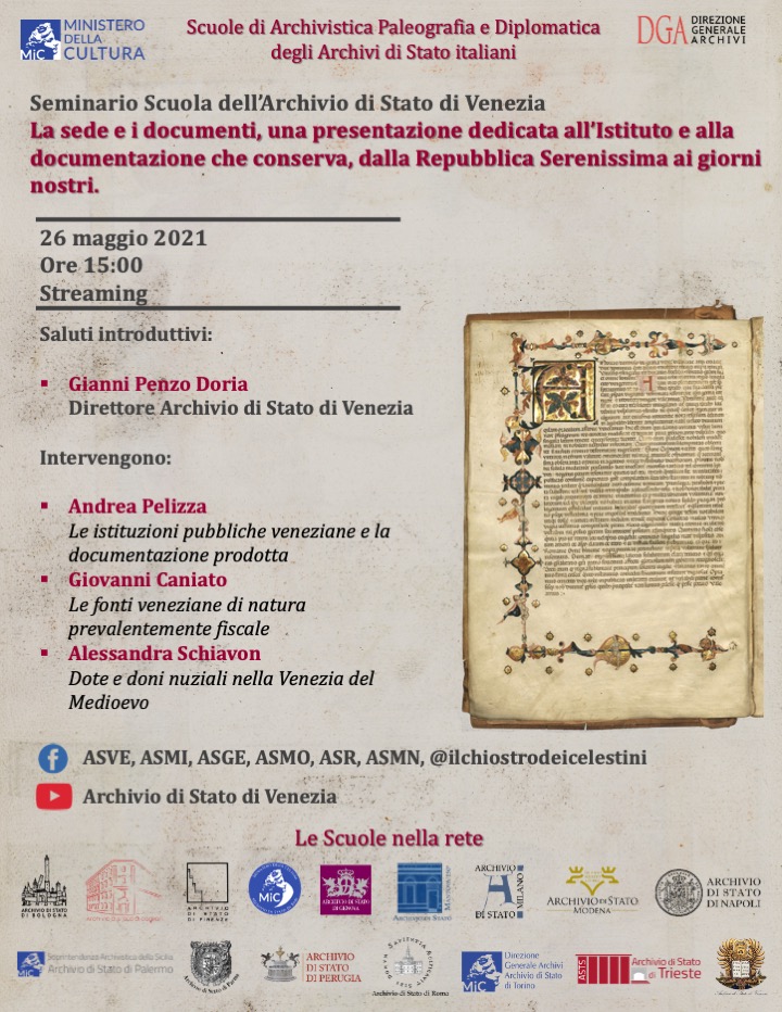 Nell’ambito degli incontri organizzati dalla rete delle scuole di APD degli Archivi di Stato italiani, l’appuntamento del 26 maggio 2021 sarà dedicato all’Archivio di Stato di Venezia.