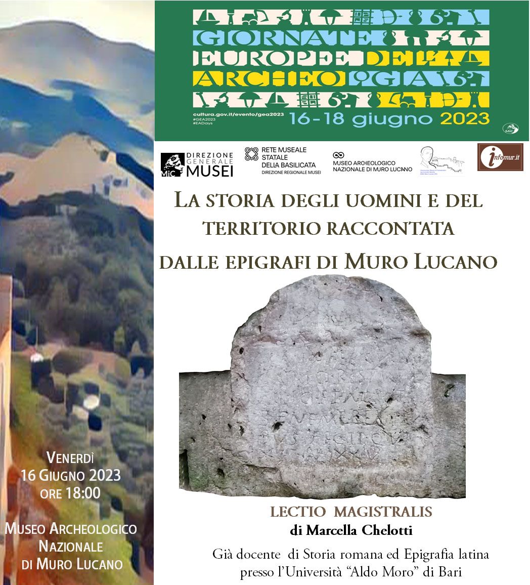 LECTIO MAGISTRALIS della Professoressa Marcella Chelotti, già docente di Storia romana ed Epigrafia latina presso l’Università “Aldo Moro” di Bari, dal titolo “La Storia degli uomini e del territorio raccontata dalle epigrafi di Muro Lucano”.[RenderImage id="50988"]