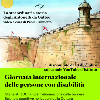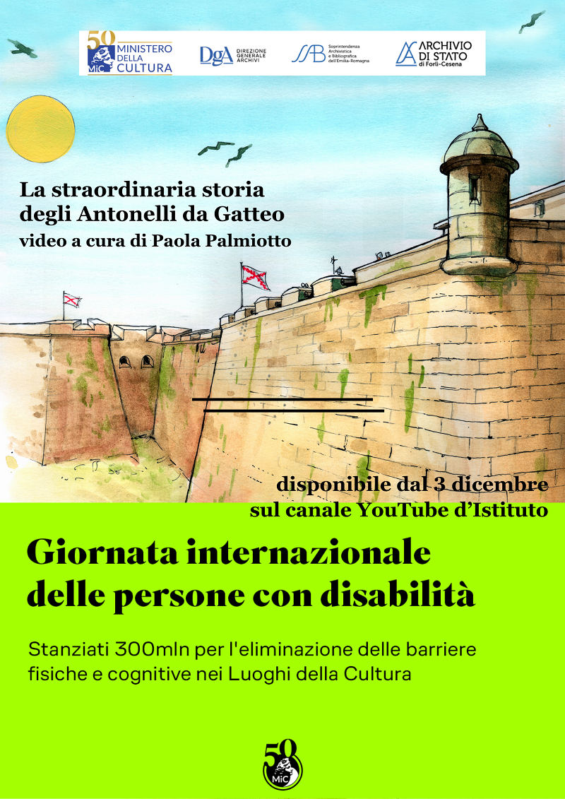 In occasione della Giornata internazionale delle persone con disabilità, sarà pubblicato sul canale YouTube dell'Archivio di Stato di Forlì-Cesena un breve video audio e sottotitolato, che illustrerà la mostra La straordinaria storia degli Antonelli da Gatteo. Una famiglia di architetti e ingegneri militari alla corte dei re di Spagna tra XVI e XVII secolo, realizzata a cura dell'Ecoistituto di Cesena - Gruppo di Ricerca sulle Tecnologie Appropriate, grazie alla ricerca storica intrapresa da Daniele Zavalloni, Michele Ceccaroni e Piero Carusone nel 2015 e allestita fino al 22 ottobre scorso presso l'Istituto.