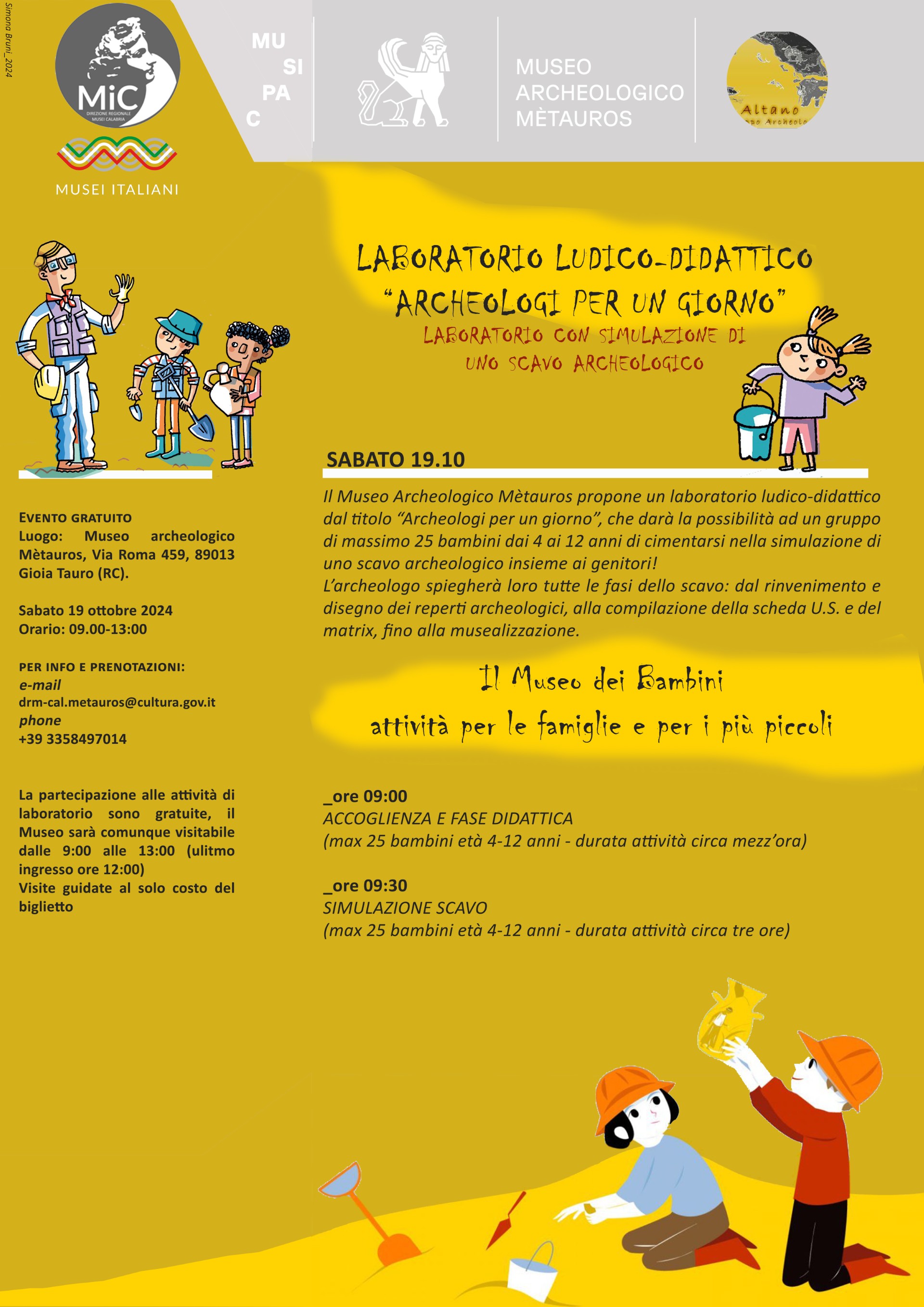 _ORE 09:00 ACCOGLIENZA E FASE DIDATTICA (max 25 bambini età 4-12 anni - durata attività circa mezz’ora) _ORE 09:30 SIMULAZIONE SCAVO (max 25 bambini età 4-12 anni - durata attività circa tre ore)
