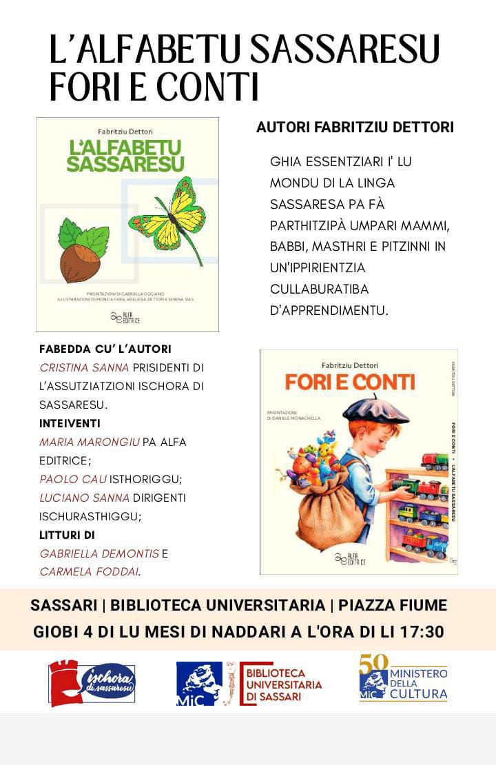 Presentazione del libro “L’Alfabetu sassaresu - Fori e Conti” di Fabrizio Dettori, pubblicato da Alfa editrice. Dopo una breve introduzione da parte del direttore della biblioteca, dott. Giovanni Fiori alla presentazione partecipano l’autore Fabrizio Dettori che dialogherà con Cristina Sanna, Presidente dell’Associazione Ischora di Sassaresu. Interverranno lo storico Paolo Cau, Maria Marongiu per la casa editrice di Quartu Sant' Elena e Luciano Sanna, Dirigente scolastico dell’I. C. di San Giuseppe a Sassari. La serata prevede inoltre una lettura “ad alta voce” di una selezione di pagine lette da Gabriella Demontis e Carmela Foddai.