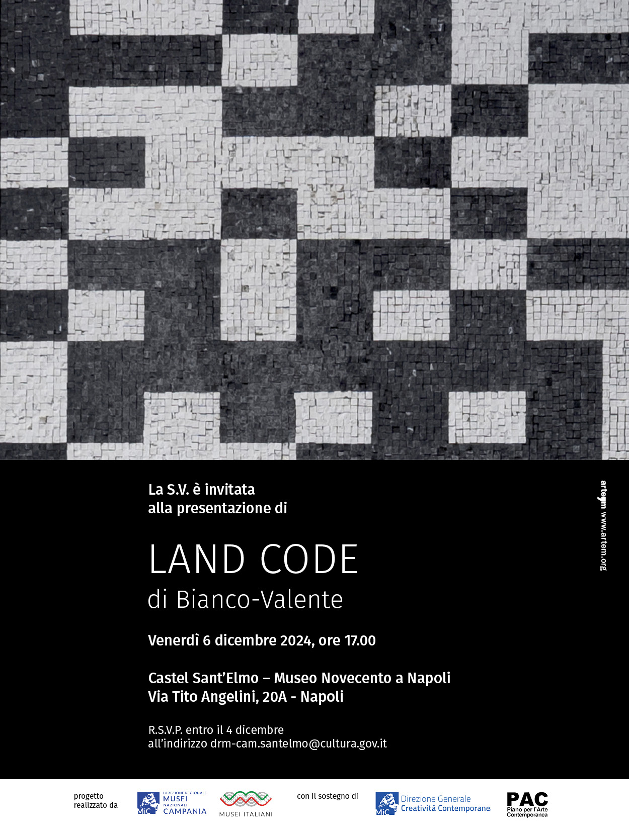 La commissione dell’opera Land Code agli artisti Bianco-Valente rientra nella politica di acquisizioni di Castel Sant’Elmo e del Museo Novecento a Napoli, finalizzata ad aggiungere nuovi tasselli al racconto della produzione degli artisti attivi in città dagli inizi del ‘900 ad oggi.