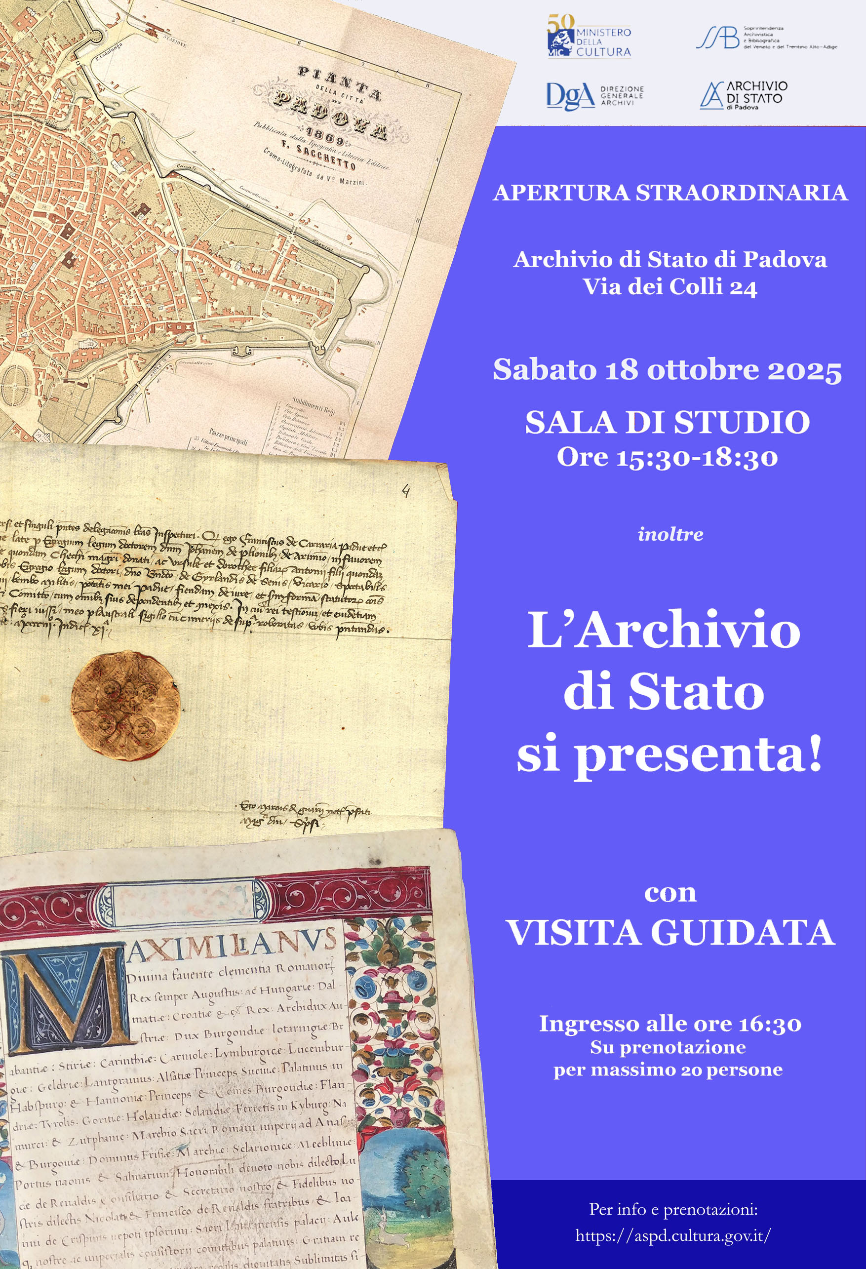 Nell'ambito del Piano di valorizzazione 2025 del Ministero della cultura, sabato 18 ottobre 2025 è programmata l'apertura straordinaria della Sala di studio dell'Archivio di Stato di Padova dalle ore 15.30 alle ore 18.30.