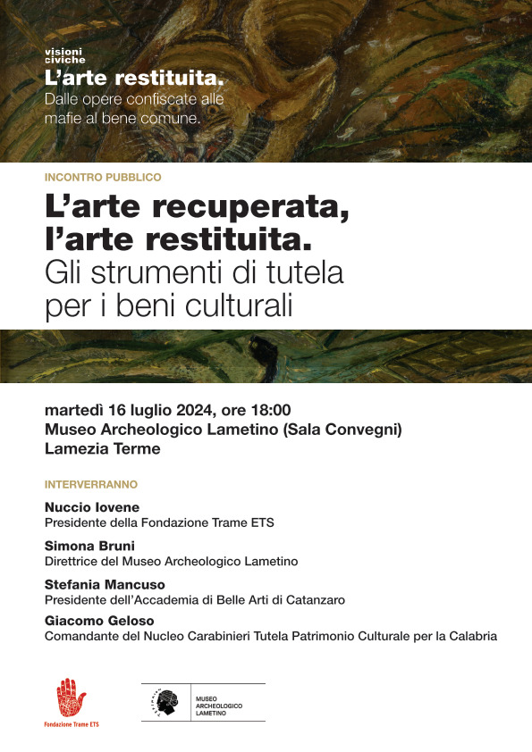 Il Museo archeologico lametino continua le attività legate alla tematica della mostra Visioni Civiche. L’arte restituita, allestita e inaugurata nell’edizione di questo anno del Festival TRAME, prsentando martedì 16 luglio, in apertura straordinaria, L’arte recuperata, l’arte restituita. Gli strumenti di tutela per i beni culturali.