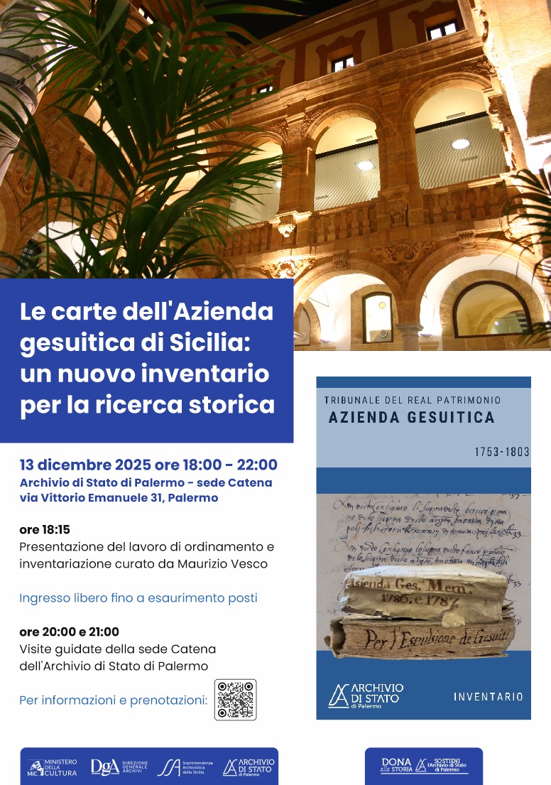 Alle ore 18:15 sarà presentato il nuovo inventario dell’Azienda gesuitica di Sicilia (1753–1803), a cura di Maurizio Vesco, funzionario archivista. A presentare il lavoro sarà il prof. Fabrizio D’Avenia, ordinario di Storia del Cristianesimo e delle Chiese presso l’Università degli Studi di Palermo. Saluti istituzionali del dott. Gabriele Capone, Dirigente della Soprintendenza Archivistica della Sicilia – Archivio di Stato di Palermo, e di Padre Walter Bottaccio, Rettore della Casa Professa di Palermo.