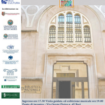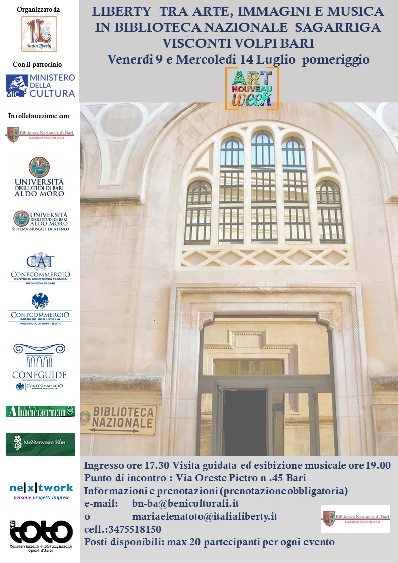 Nell’ambito della III edizione della settimana internazionale dell’Art Nouveau promossa dall’Associazione Italia Liberty, il 9 e il 14 luglio 2021 alle ore 17.30 sarà visitabile la Biblioteca e una rassegna documentario-bibliografica dedicata ai teatri di Bari; in collaborazione con l’Associazione Misurecomposte un concerto di musica classica dedicato al primo Novecento concluderà le serate.