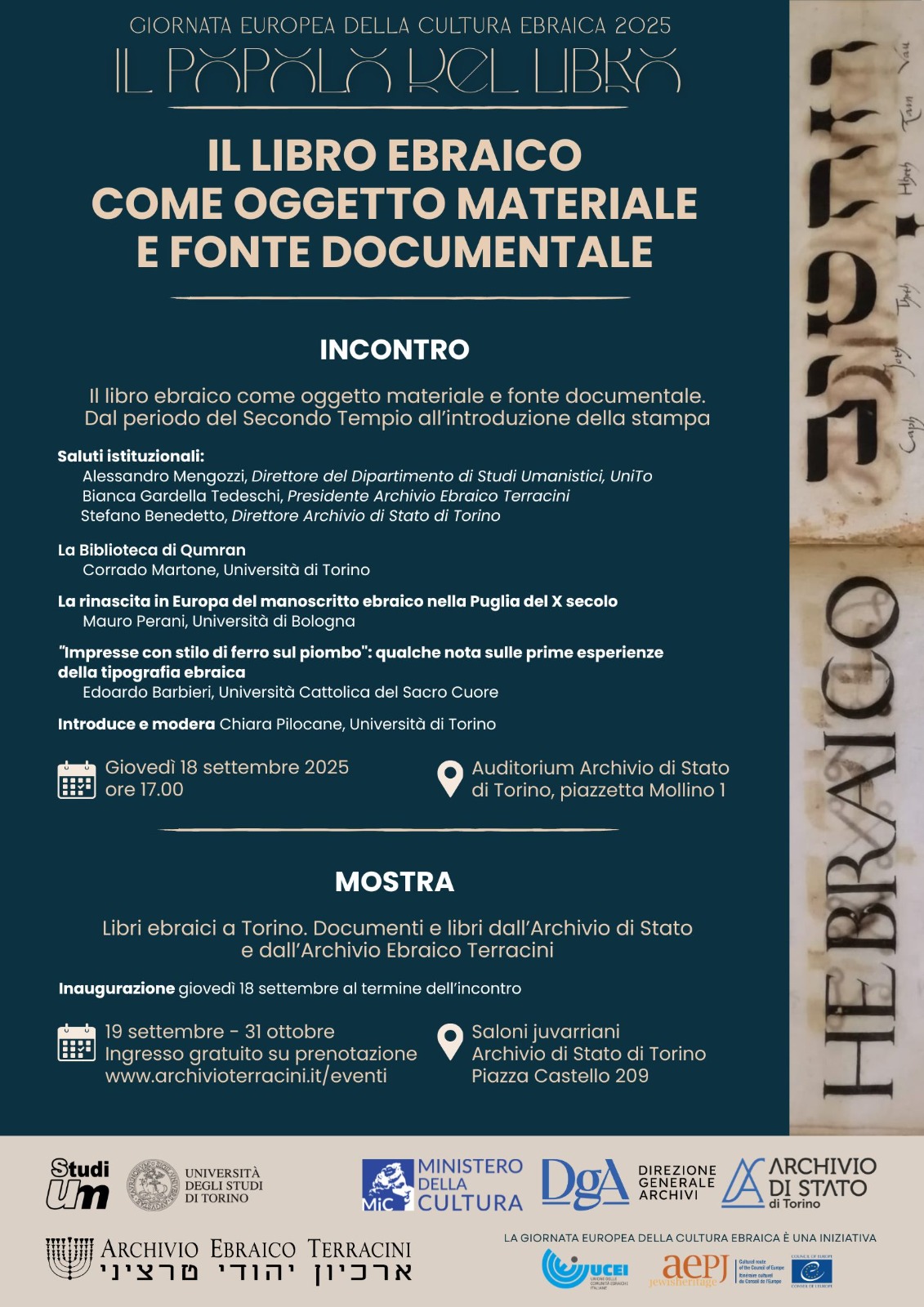 Cogliendo l’occasione della Giornata Europea della Cultura Ebraica, quest’anno dedicata al libro, il Dipartimento di Studi Umanistici dell’Università di Torino, l’Archivio Ebraico Terracini e l’Archivio di Stato di Torino organizzano un’iniziativa divulgativa per avvicinare il pubblico al tema del libro ebraico, con particolare riferimento alla storia della comunità cittadina, e per offrire anche ai non specialisti l’opportunità di conoscere il patrimonio dei due Archivi. Insieme, i tre Istituti hanno dato vita a un progetto che prevede un incontro divulgativo dal titolo Il libro ebraico come oggetto materiale e fonte documentale e una piccola mostra intitolata Libri ebraici a Torino. Documenti e libri dall’Archivio di Stato e dall’Archivio Ebraico Terracini.